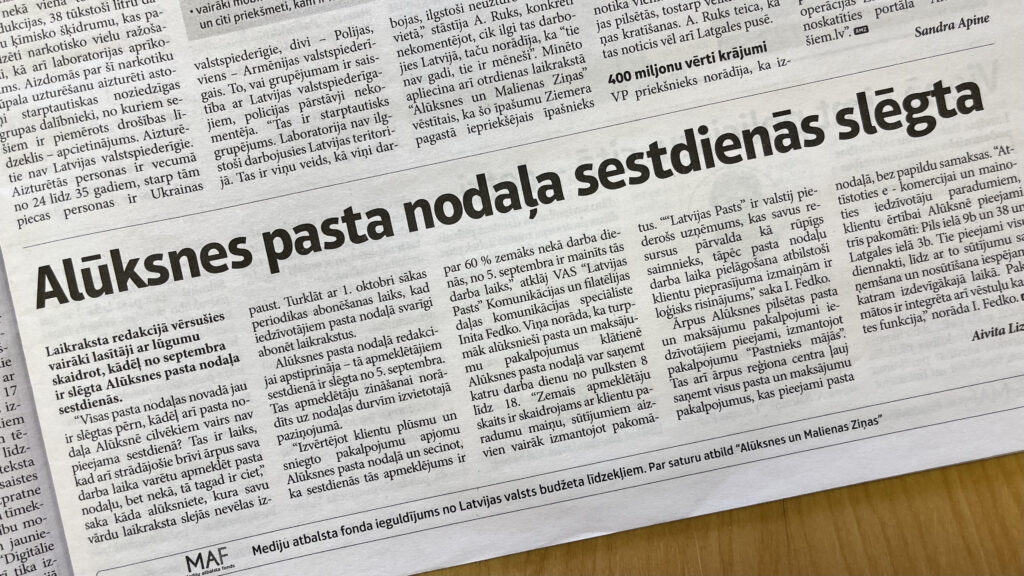 Laikraksts jau vēstīja, ka redakcijā satraukti vērsās iedzīvotāji un lūdza skaidrot, kādēļ sestdienās no 5. septembra slēgta Alūksnes pirmā pasta nodaļa. VAS “Latvijas pasts” Komunikācijas un filatēlijas daļas komunikācijas speciāliste Inita Fedko pasta slēgšanu sestdienās Alūksnē skaidroja ar klientu plūsmas un pasta sniegto pakalpojumu apjoma samazināšanos sestdienās. Tas esot par 60 % zemāks nekā darba dienās – viņa teica laikrakstam.