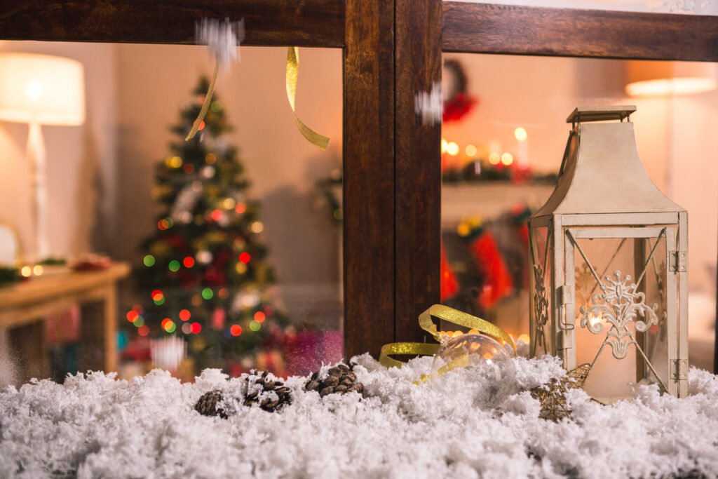 Pine cone decoration on fake snow during christmas time