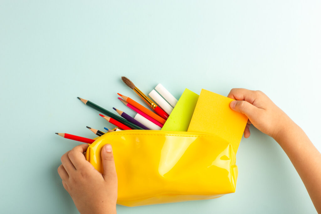 top view little kid holding yellow pen box full of colorful pencils on ice-blue background school kid lessons color photo