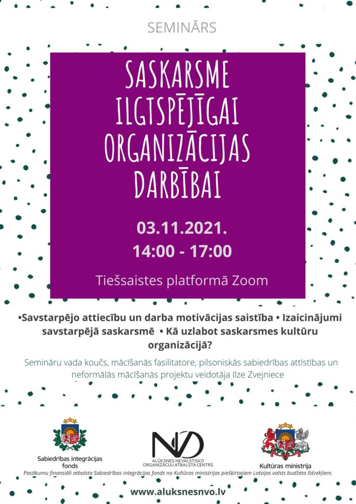 3.novembrī pulksten 14.00 norisināsies praktiskais tiešsaistes seminārā “Saskarsme ilgtspējīgai organizācijas darbībai”.