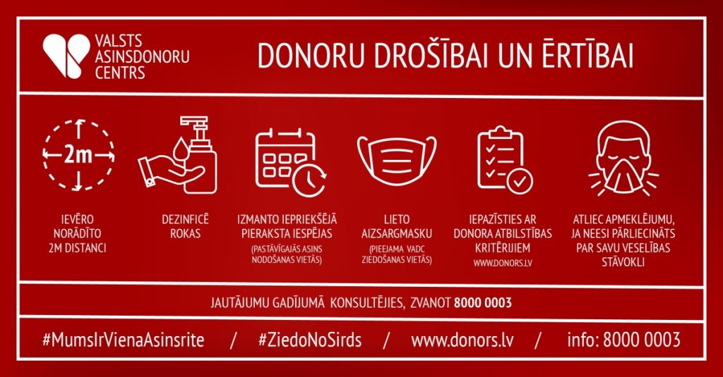 - ir pieejami individuālie aizsardzības līdzekļi (sejas maskas) gan donoriem, gan darbiniekiem.