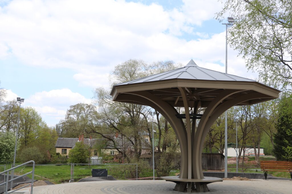 Aktīvās atpūtas parka teritorijā uzstādīta nojume, soliņi, atkritumu tvertnes, ierīkotas labierīcības, dzeramā ūdens brīvkrāns, apgaismojums, videokameras, veikta teritorijas labiekārtošana.