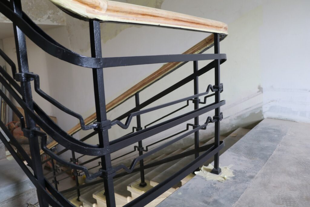 Šobrīd turpinās aktīvi jaunizveidotās kāpņu telpas sienu mūrēšanas darbi, kur pēc ēkas pārbūves atradīsies pacēlājs, tā nodrošinot piekļuvi personām ar kustību traucējumiem. Tāpat arī norit betona kāpņu remonts galvenajā trepju telpā, kurai līdzās tiek attīrītas flīžu šuves un aizpildītas ar atbilstošiem materiāliem. Atsevišķas flīzes tiek arī nomainītas. Jaunu krāsojumu ieguvušas arī kāpņu margas.