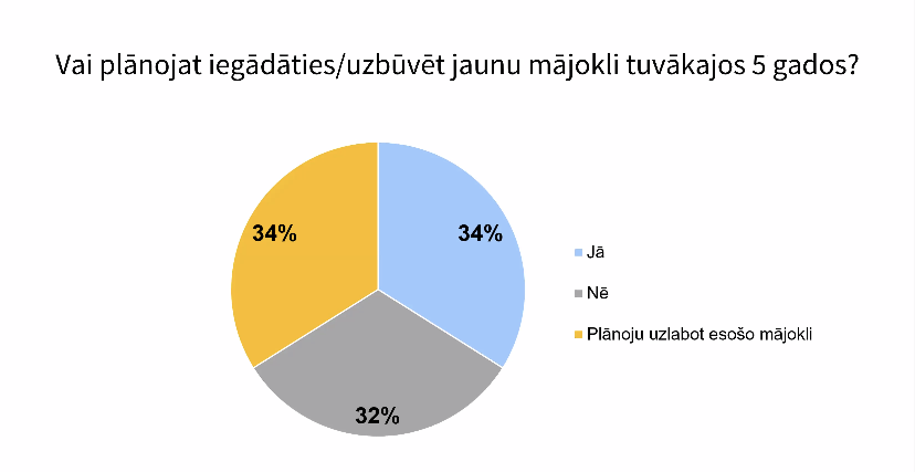 ► Aptuveni 30 % aptaujā piedalījušos minējuši, ka tuvāko piecu gadu laikā varētu plānot iegādāties vai būvēt jaunu mājokli, tikpat līdzīgs īpatsvars paredz drīzāk ieguldīties esošā mājokļa uzlabošanā, vai neparedz jauna mājokļa iegādi.
