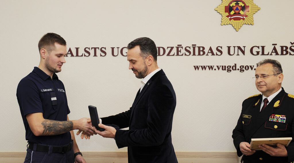 Šodien, 14. decembrī, Valsts ugunsdzēsības un glābšanas dienestā (VUGD) Valsts policijas jaunākajam inspektoram Tomam Šneideram tika pasniegta Iekšlietu ministrijas apbalvojuma zīme “Par pašaizliedzību”.