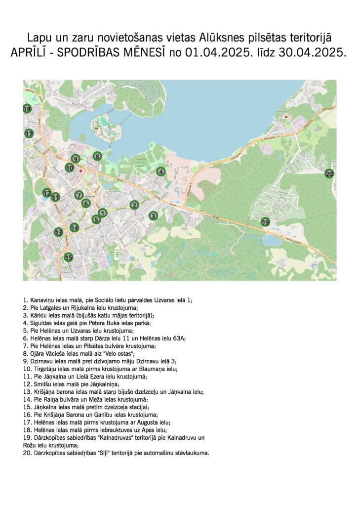 Lapu un zaru novietošanas vietas Alūksnes pilsētas teritorijā: