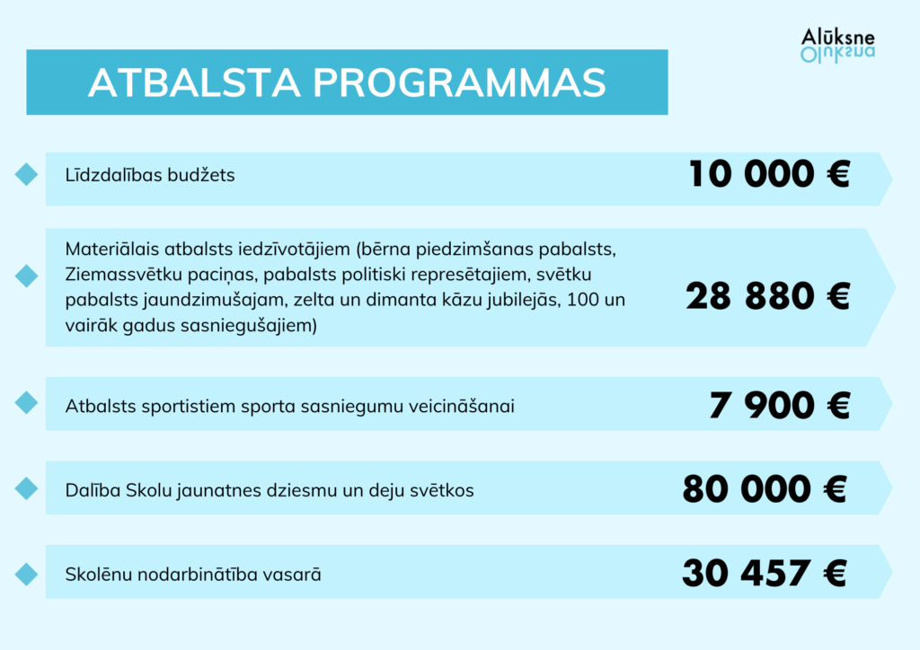 Tā kā šis ir Skolu jaunatnes dziesmu un deju svētku gads, šim mērķim pašvaldības budžetā paredzēti 80 000 EUR, savukārt līdzdalības budžetam – 10 000 EUR.