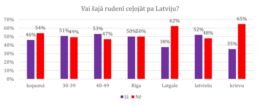 Gandrīz puse jeb 46% Latvijas iedzīvotāju šajā rudenī izmantojuši iespēju apceļot Latviju, secināts Latvijas Investīciju un attīstības aģentūras (LIAA) sadarbībā ar pētījumu kompānijas “Norstat” veiktajā iedzīvotāju aptaujā.