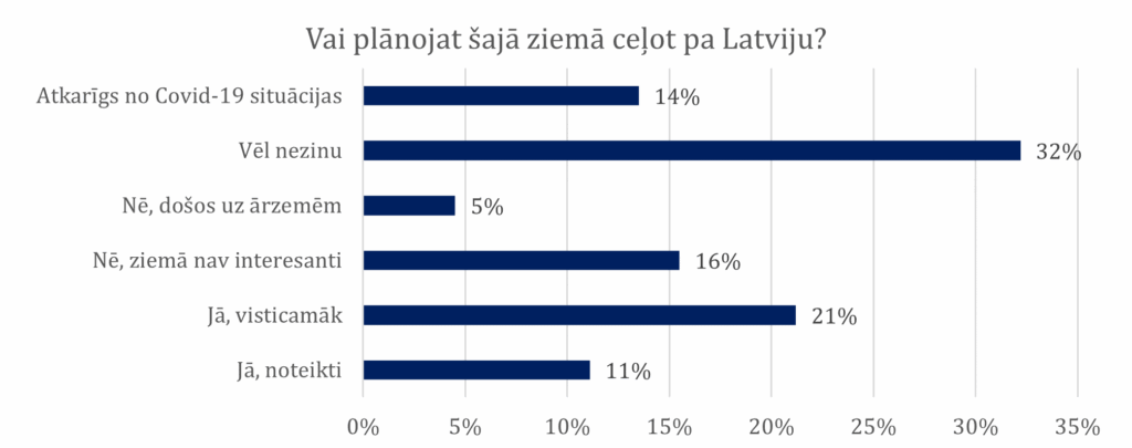 Vērtējot iespējas izbaudīt vietējā tūrisma pakalpojumus šajā ziemā, kopumā 32% aptaujas dalībnieku ir noskaņoti pozitīvi – tajā skaitā 21% visticamāk un 11% noteikti apceļos Latviju arī ziemas periodā. Vienlaikus arī 32% vēl nezina par Latvijas apceļošanu ziemas periodā, bet 14% skatīsies Covid-19 situācijas attīstību, savukārt 16% respondentu uzskata, ka ziemā nav interesanti ceļot.
