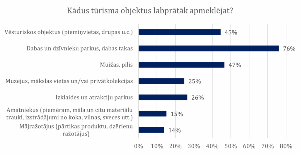 Cenšoties izprast Latvijas iedzīvotāju ceļošanas paradumus, aptaujas dalībniekiem tika jautāts, kādus tūrisma objektus viņi labprātāk apmeklēja šajā rudenī. 76% viesojās dabas un dzīvnieku parkos vai dabas takās, 47% apskatīja muižas un pilis, savukārt trešajā pozīcijā ierindojas vēsturiskie objekti – tos apmeklēja 45% respondentu.