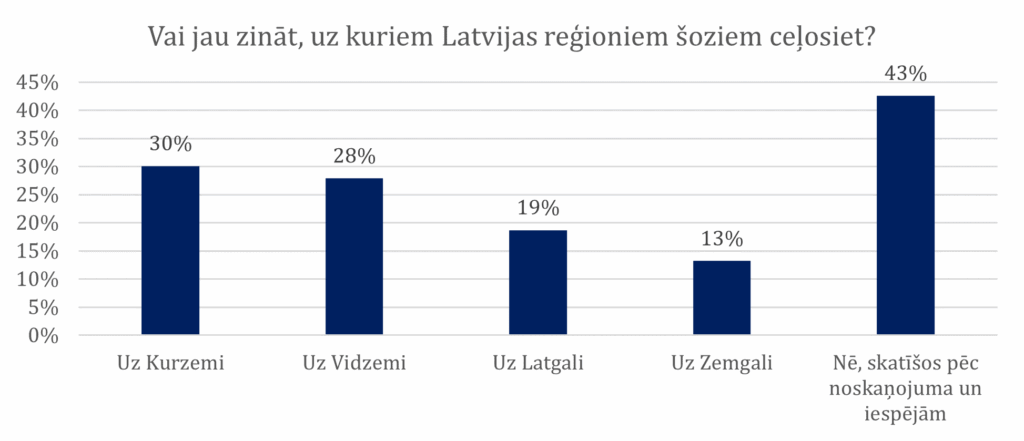 Savukārt no Latvijas reģioniem aptaujas dalībniekus visvairāk interesē Kurzeme – 30% plāno šoziem doties turp, 28% iecerējuši doties uz pauguraino Vidzemi, 19% apceļos Latgali un 13% brauktu uz Zemgali.