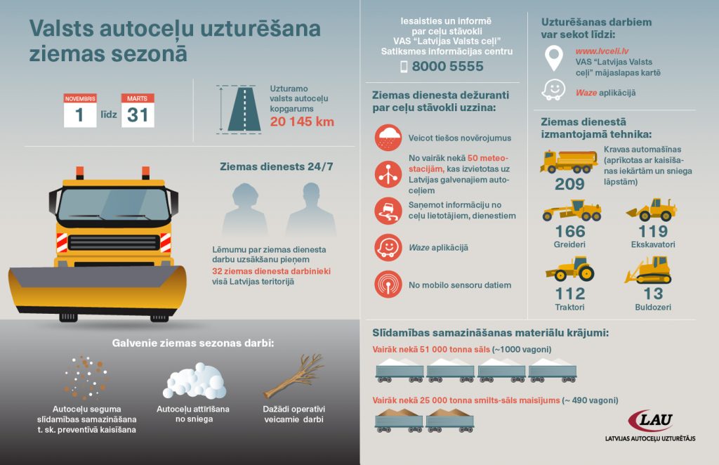 VAS “Latvijas autoceļu uzturētājs” (LAU) ziemas dienests ar 1.novembri ir uzsācis darbu diennakts režīmā, lai nepieciešamības gadījumā operatīvi varētu nodrošināt valsts autoceļu caurbraucamību. Visā valsts teritorijā ir izvietotas kaisāmo materiālu un tehnikas parka bāzes, kā arī situāciju par autoceļa stāvokli monitorē 32 ziemas dienesta dežuranti. Galvenie ziemas sezonas darbi ir autoceļu brauktuvju attīrīšana no sniega un slīdamības samazināšana, t.sk. preventīvā kaisīšana.