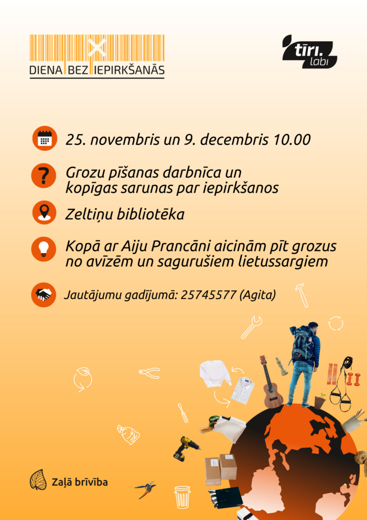 Biedrība “Zaļā brīvība” iniciatīvas “Tīri.Labi. Pilsēta bez atkritumiem” ietvaros no 24. novembra līdz 15. decembrim rosina pievienoties “Dienai bez iepirkšanās”. Aicinājumam atsaukušās un jēgpilnas aktivitātes īstenos vairākas iedzīvotāju grupas visā Latvijā. Daudziem no šiem pasākumiem var pievienoties ikviens interesents.