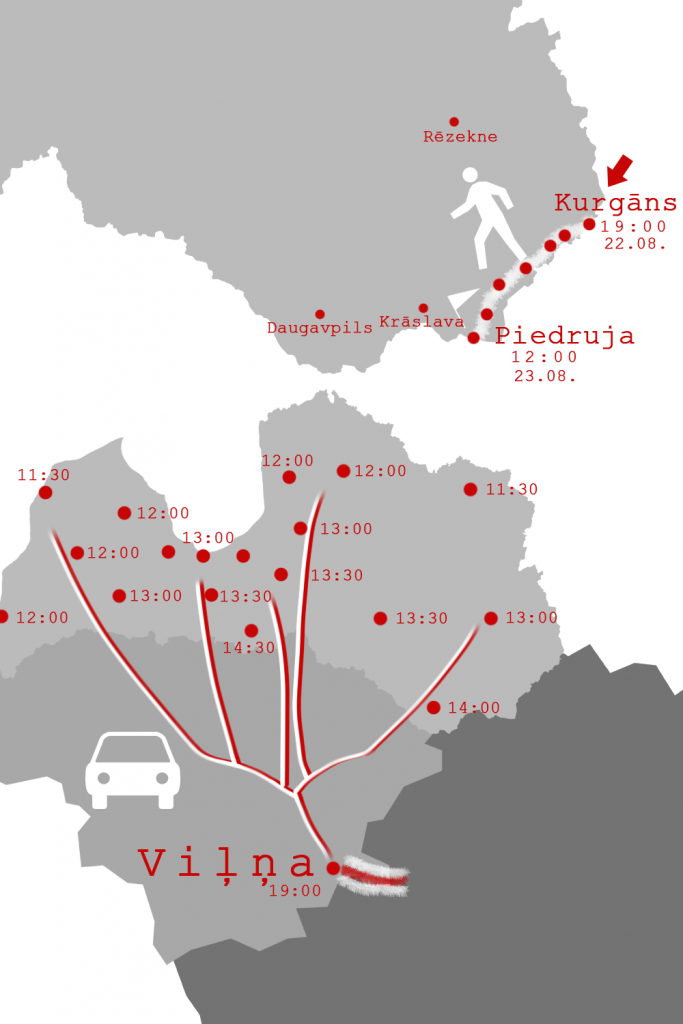 Latvijas pusē akcija sāksies 22.augusta vakarā Zilupes novadā, Pasienes pagasta Meikšānos, kad no valstu robežu krustpunkta jeb tā dēvētā Draudzības kurgāna plkst.19 sāksies gājiens gar Baltkrievijas robežu. Tā noslēgums notiks 23.augustā Krāslavas novadā Piedrujā, kur plkst.12 norisināsies solidaritātes akcijas atklāšanas pasākums.