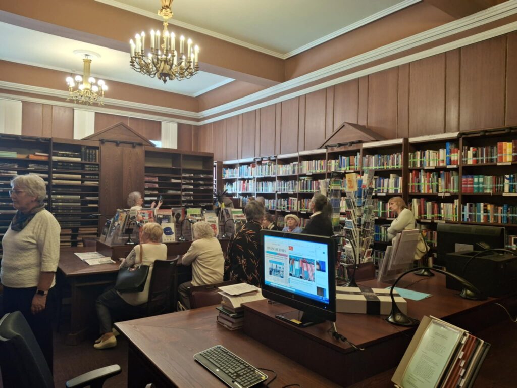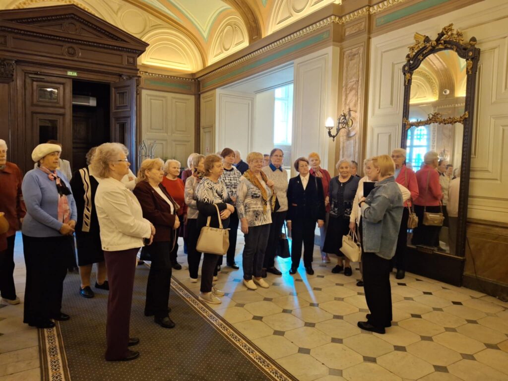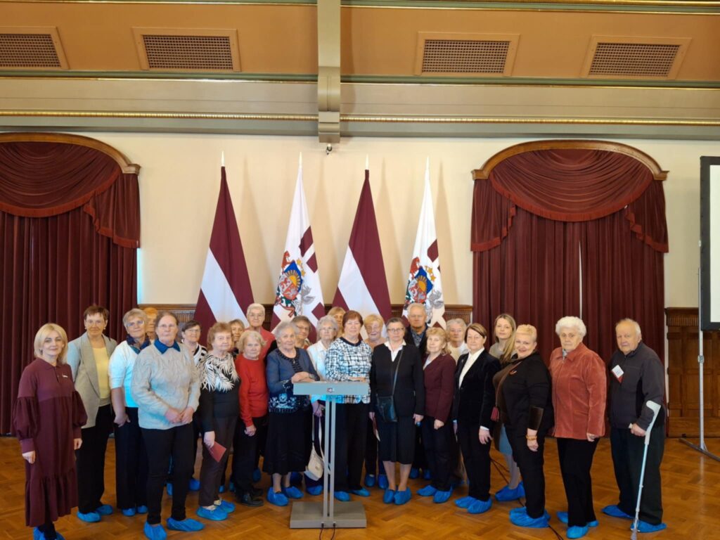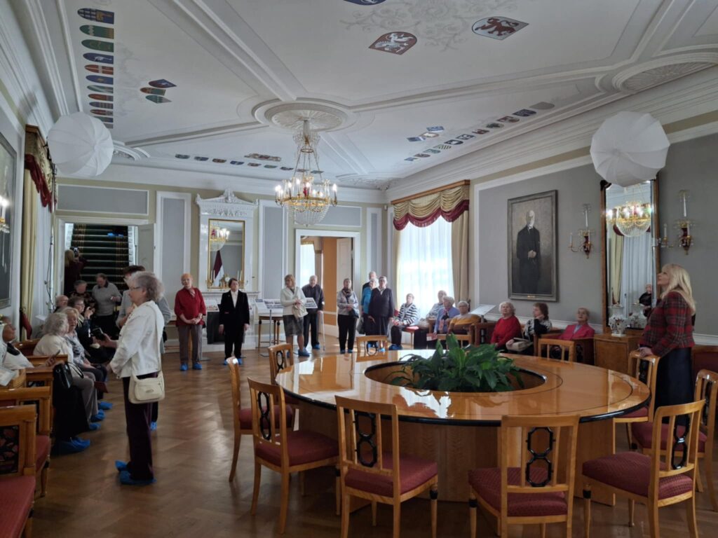 Rīgas pilī apskatījām reprezentācijas zāles un telpas: Dāvanu zāli, Svētku zāli, Sūtņu akreditācijas zāli, Ģerboņu zāli, Zaļo zāli, Rīgas istabu, Čakstes kabinetu, Svētku salonu, Dāmu salonu, Kungu salonu un Balto zāli, kurā, lai pārliecinātos par tās akustiku, vienojāmies kopīgā dziesmā.