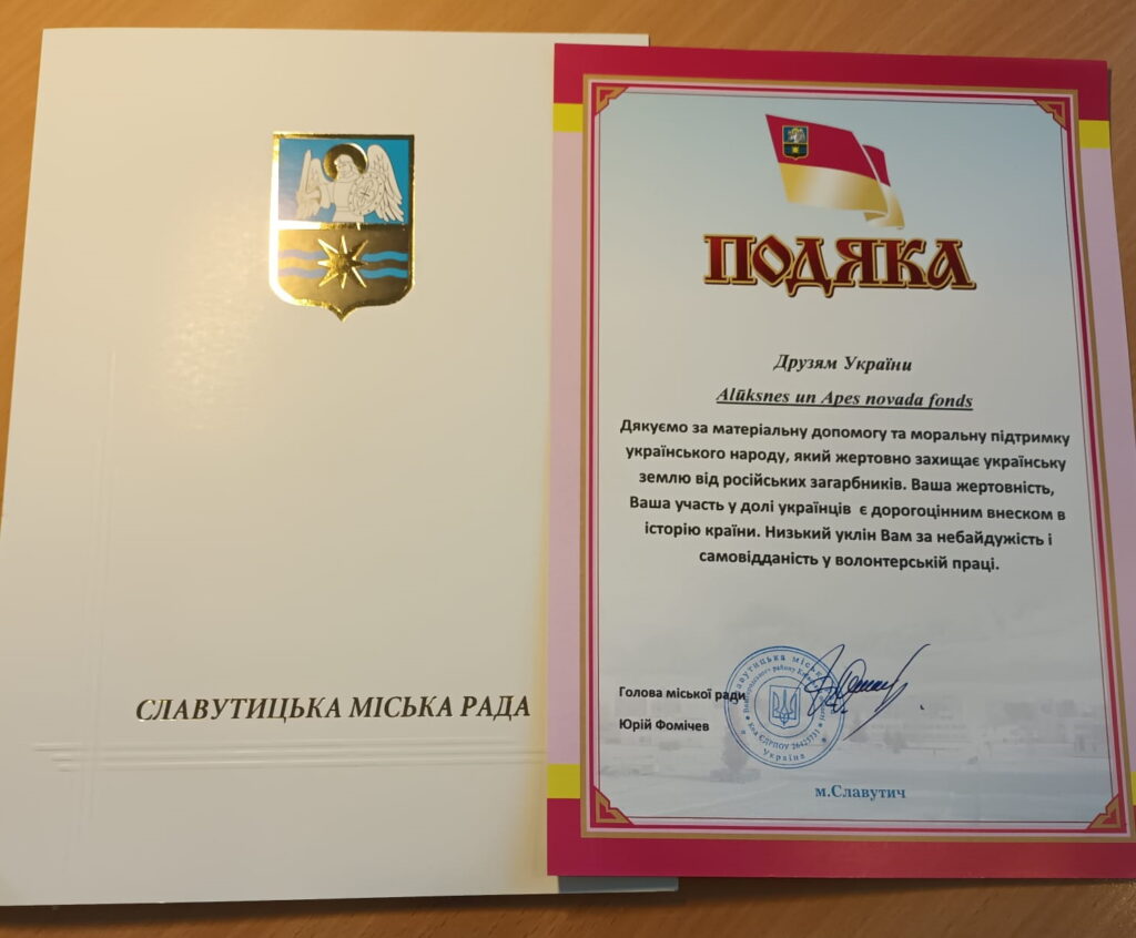 Savukārt Slavutičas pilsētas dome Ukrainā fondam atsūtījusi pateicību par materiālo palīdzību un morālo atbalstu Ukrainas tautai un aizsargiem.
