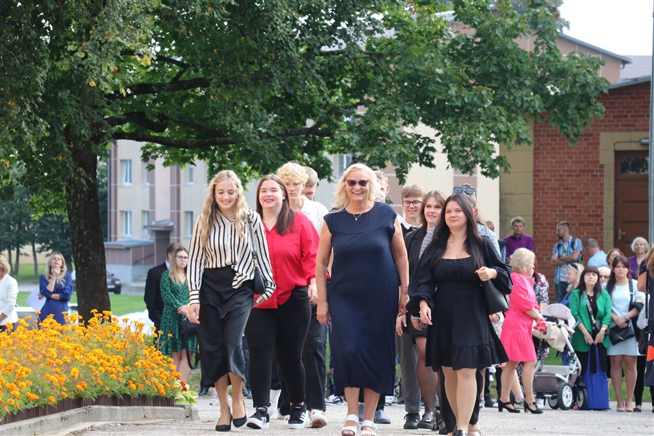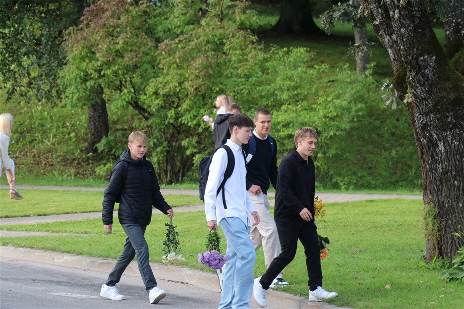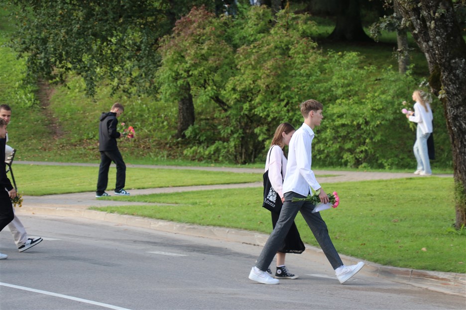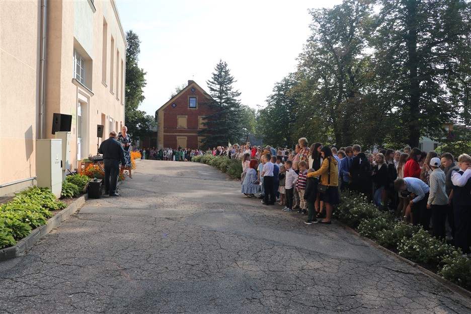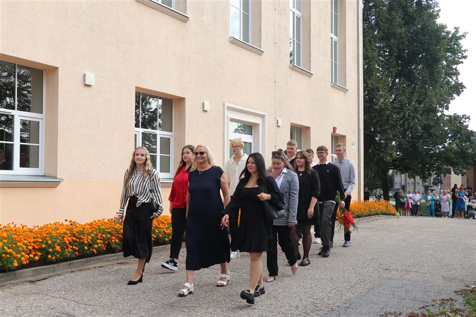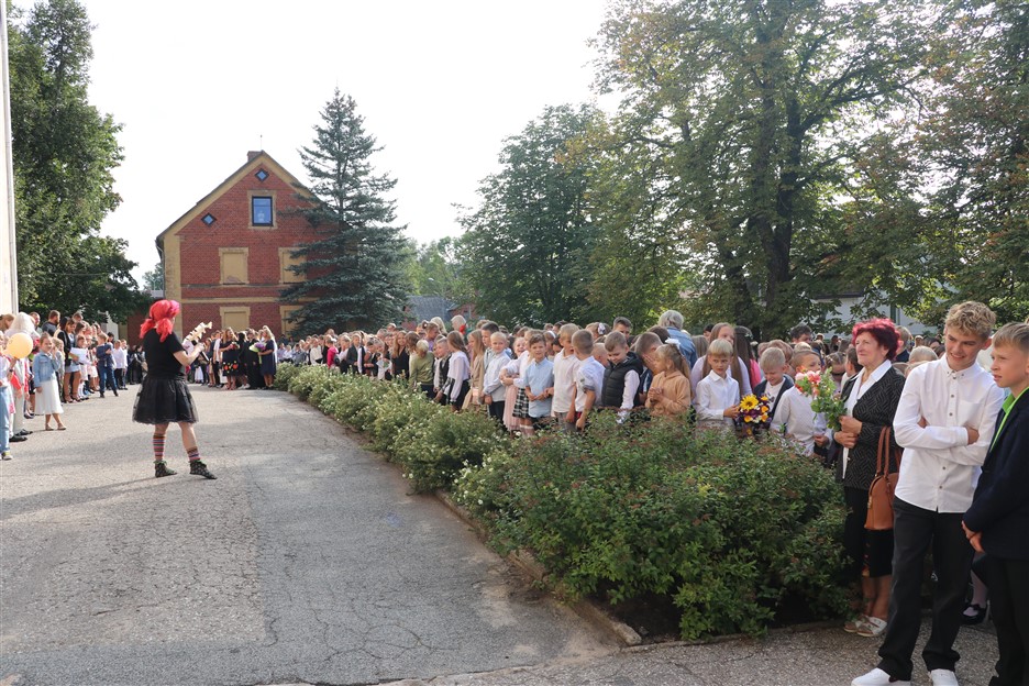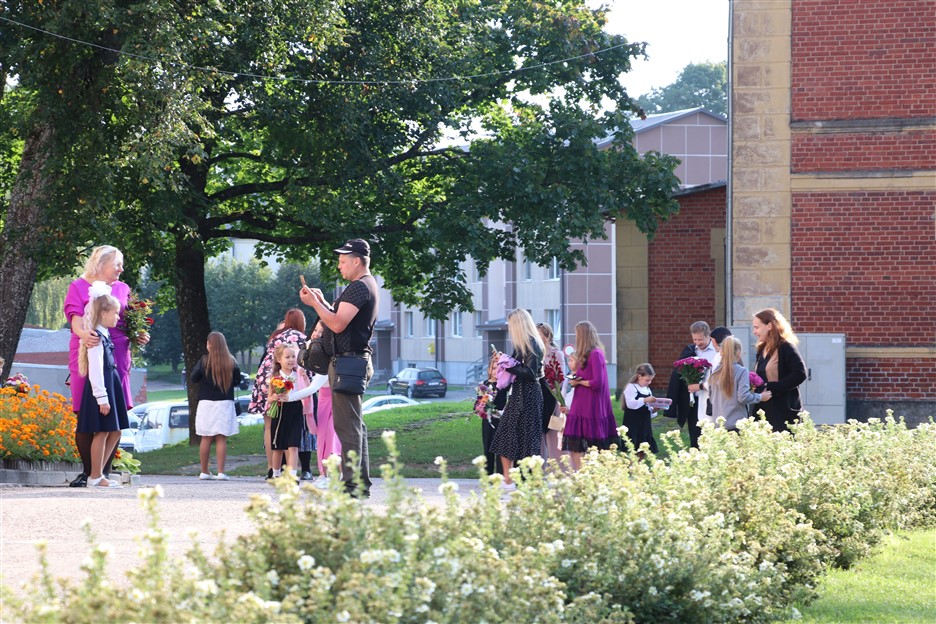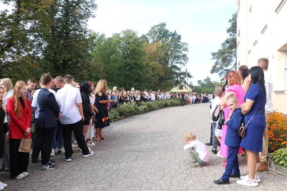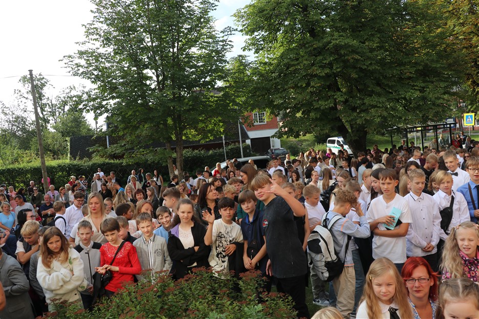 Alūksnes vidusskolas skolēni pulcējas skolā Lielā Ezera ielā, lai atzīmētu mācību gada sākumu. Kopā Alūksnes vidusskolā šogad mācās 912 skolēni. Skolā strādās 83 skolotāji, 29 tehniskie darbinieki.