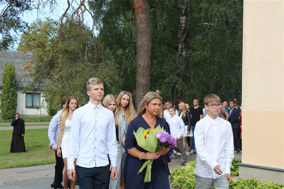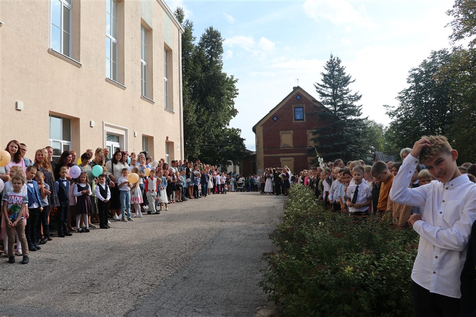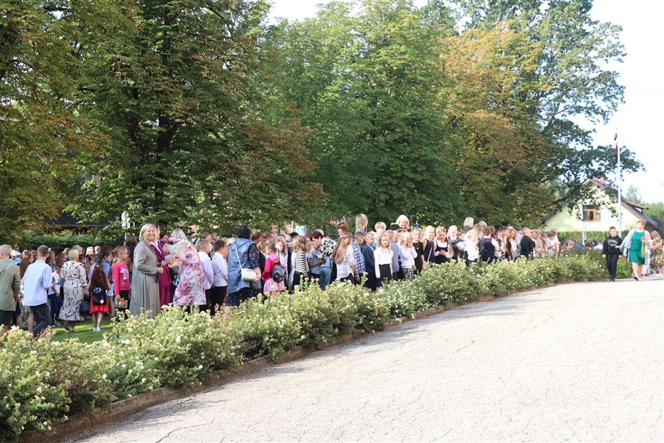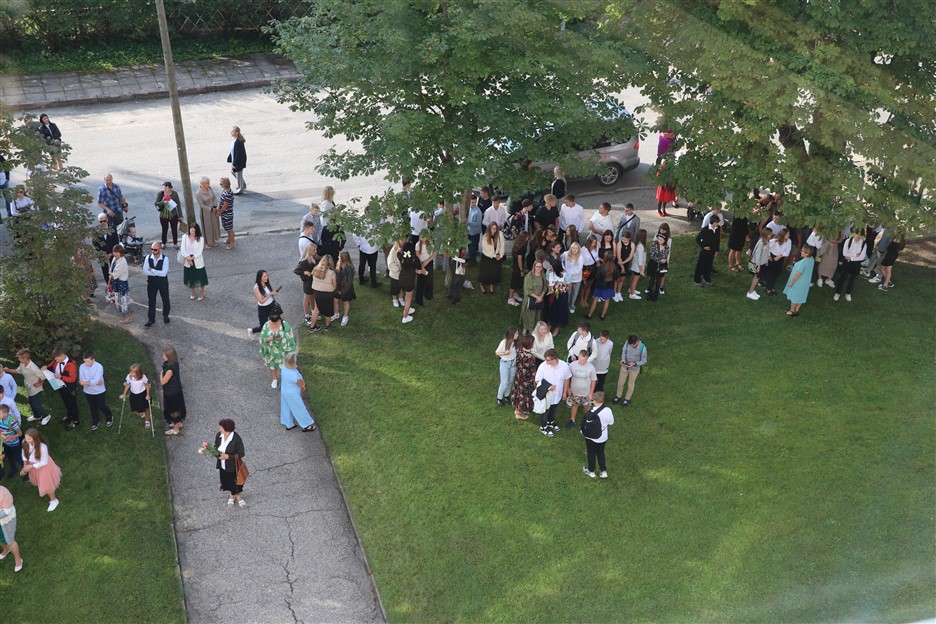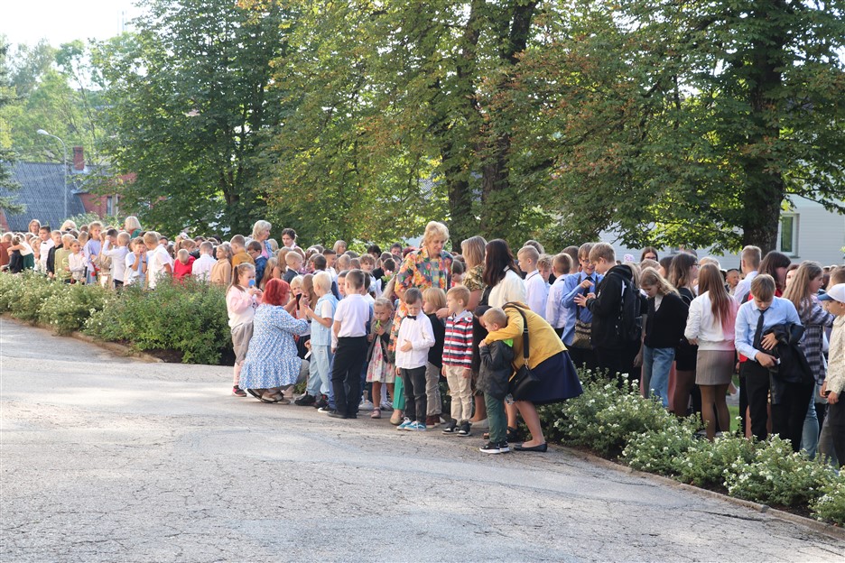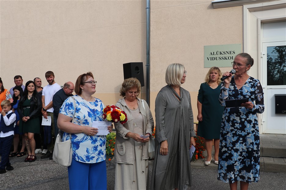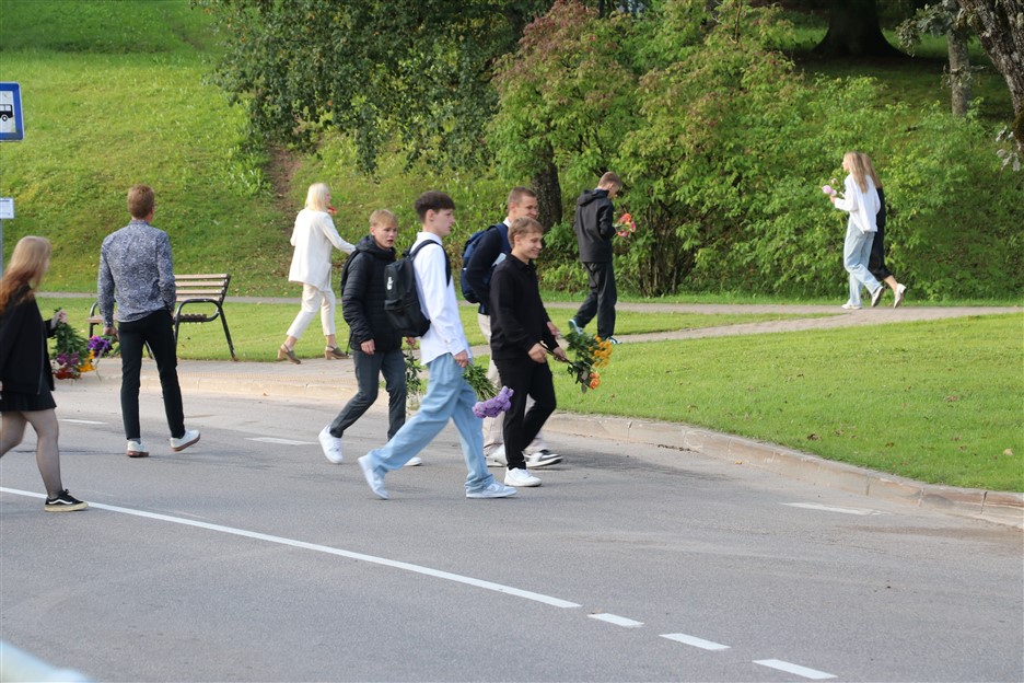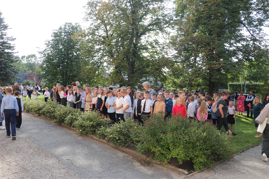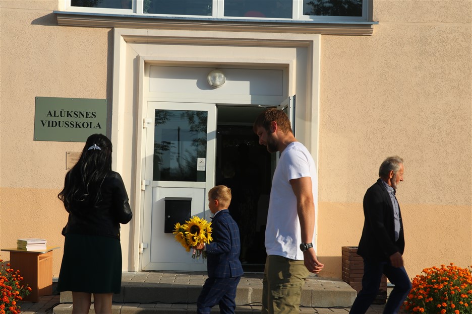 Alūksnes vidusskolas skolēni pulcējas skolā Lielā Ezera ielā, lai atzīmētu mācību gada sākumu. Kopā Alūksnes vidusskolā šogad mācās 912 skolēni. Skolā strādās 83 skolotāji, 29 tehniskie darbinieki.