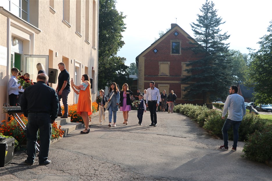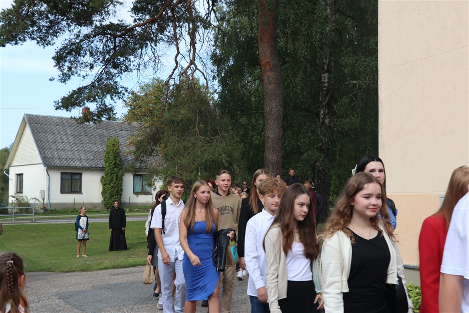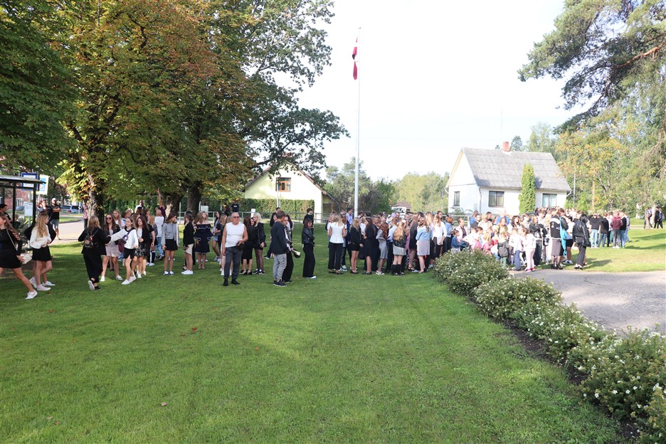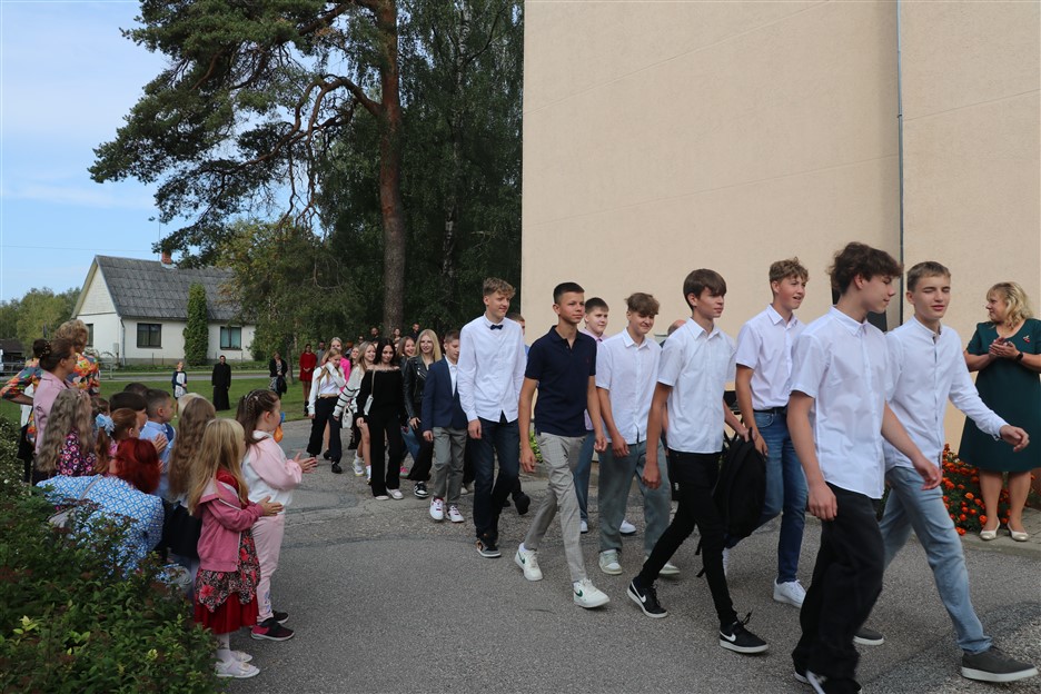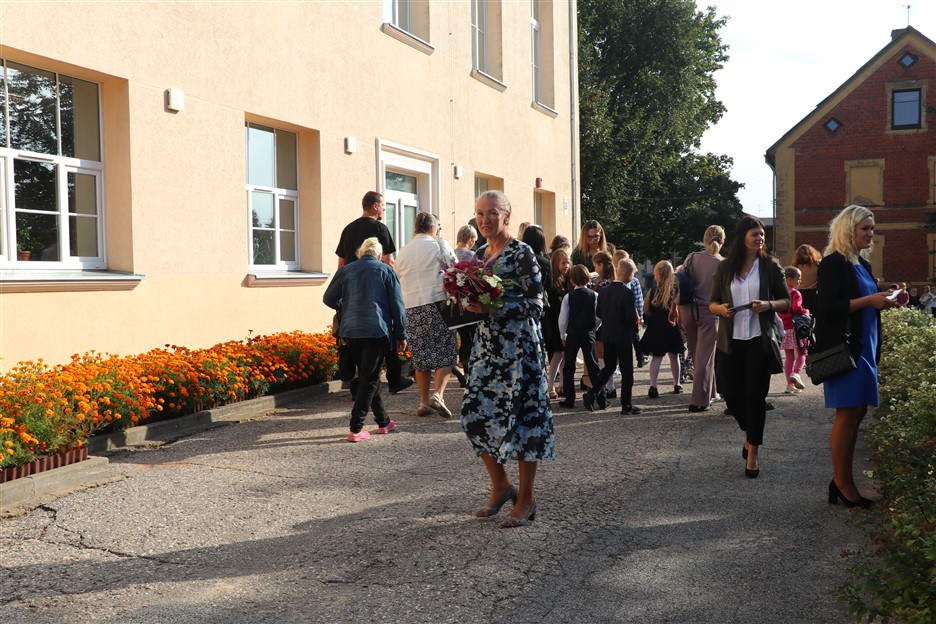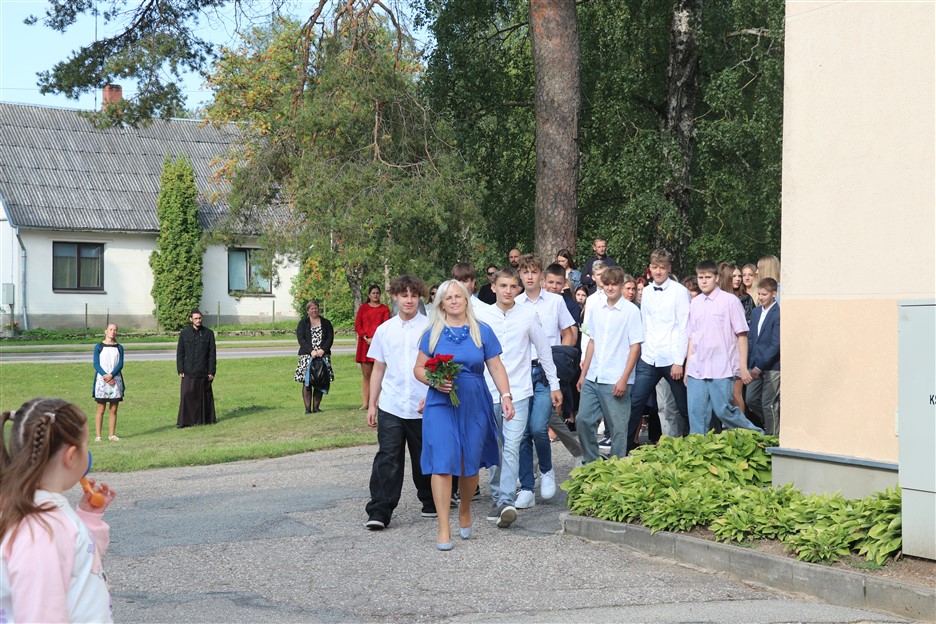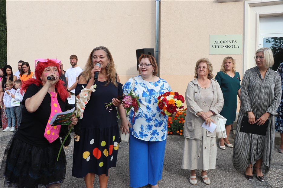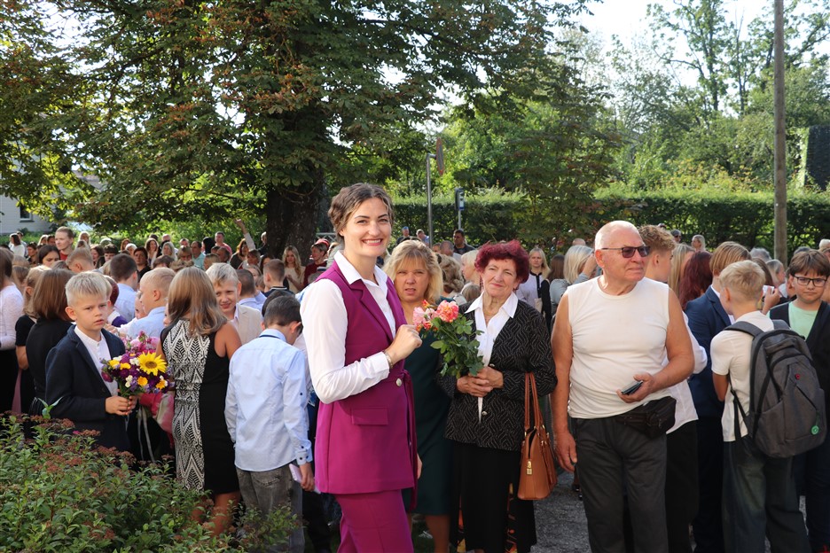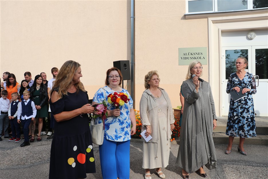 Alūksnes vidusskolas skolēni pulcējas skolā Lielā Ezera ielā, lai atzīmētu mācību gada sākumu. Kopā Alūksnes vidusskolā šogad mācās 912 skolēni. Skolā strādās 83 skolotāji, 29 tehniskie darbinieki.