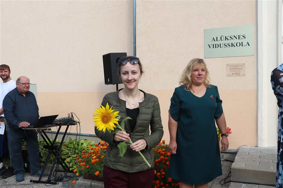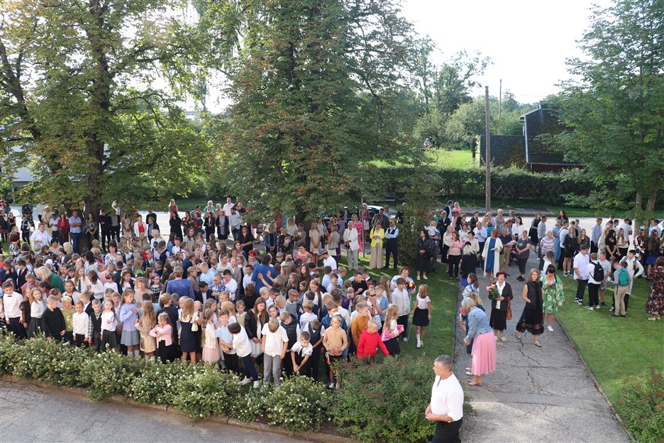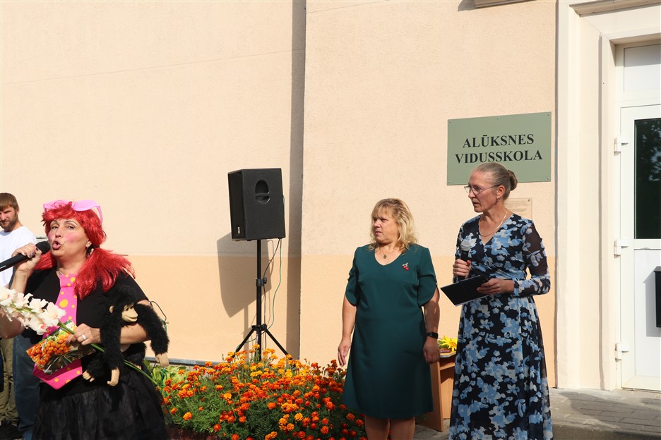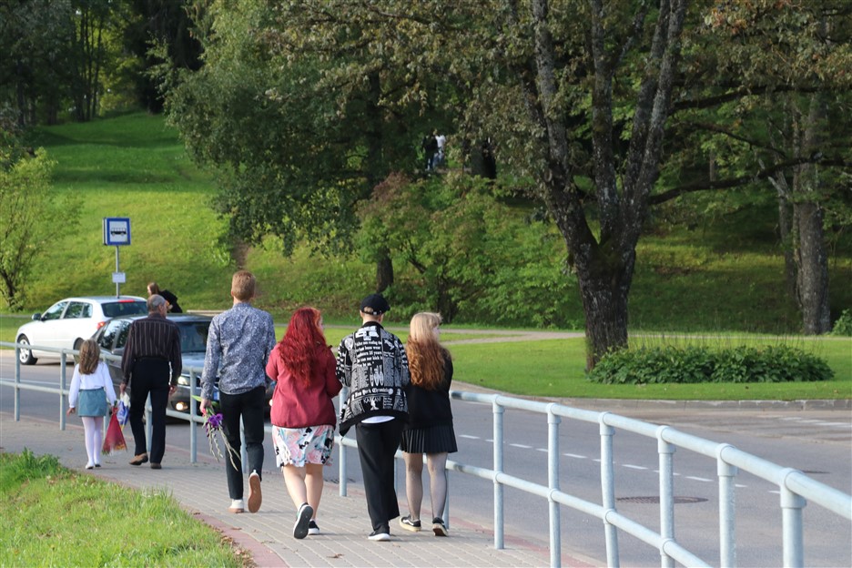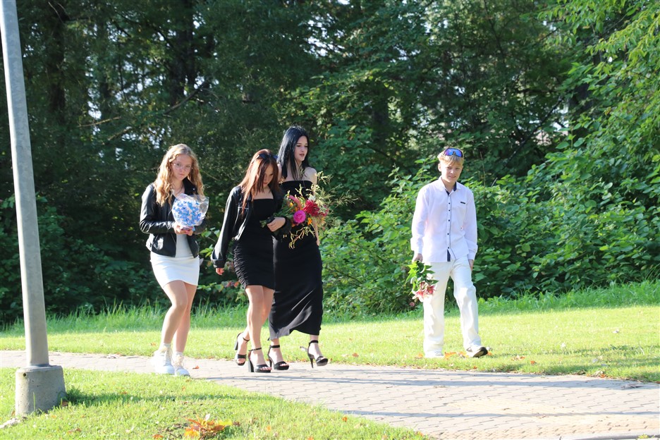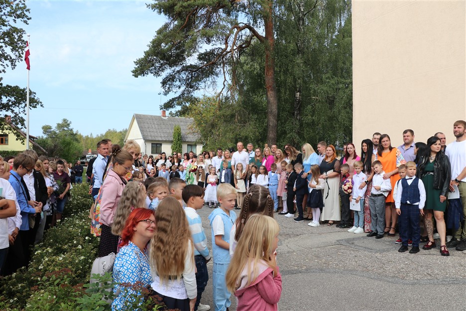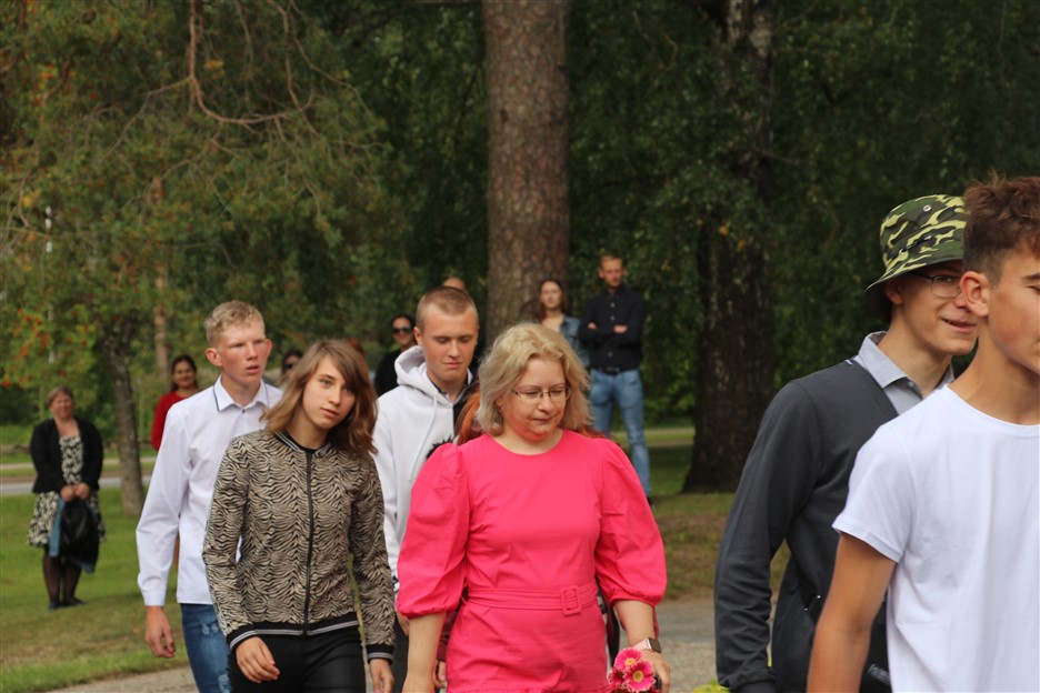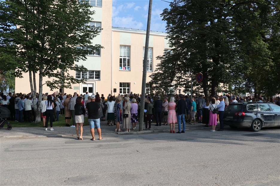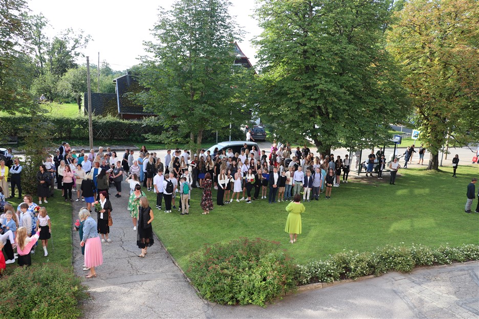 Alūksnes vidusskolas skolēni pulcējas skolā Lielā Ezera ielā, lai atzīmētu mācību gada sākumu. Kopā Alūksnes vidusskolā šogad mācās 912 skolēni. Skolā strādās 83 skolotāji, 29 tehniskie darbinieki.