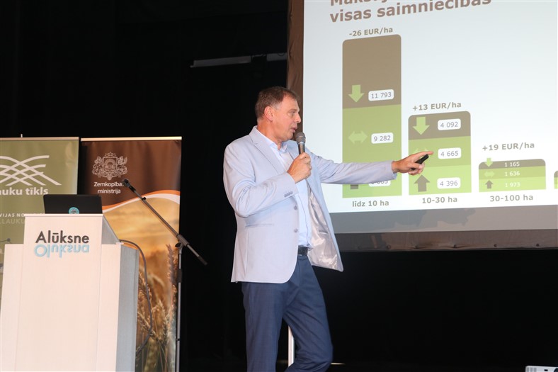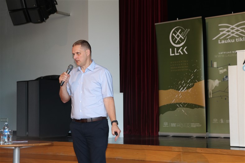 ZM Tirgus un tiešā atbalsta departamenta direktors Zigmārs Ķikāns iepazīstināja klātesošos ar ieviestajām izmaiņām lauksaimniecības nozarē. Viņš uzsvēra, ka svarīgs ir aktīvs lauksaimnieks. “Pagājušajā gadā lielu ažiotāžu un satraukumu radīja ilggadīgo zālāju saglabāšanas prasība. Mums izdevās grozīt stratēģisko plānu. Divus gadus ar komisiju runājām par to, ka regulās ir jāparedz Latvijas un abu pārējo Baltijas valstu specifiskā situācija ilggadējo zālāju rādītāju aprēķināšanā, sniedzām dažādus priekšlikumus. Pusotru gadu Eiropas Komisija mūs nedzirdēja, mūsu piedāvājumi tika nolikti malā, tāpēc, ka lielākajā daļā Eiropas Savienības nebija problēmu. Šogad janvārī notika plaši protesti visā Eiropas Savienībā. Ļoti protestēja tieši Lietuvas lauksaimnieki, kuriem jau bija pienākums atjaunot ilggadīgos zālājus. Šogad regula tika grozīta. Ir jaunas opcijas attiecībā uz ilggadīgajiem zālājiem. Pagājušajā gadā redzējām, kāds ir tas temps, kādā ilggadīgie zālāji pārveidoti. Šogad zālāju platība pieauga par aptuveni 500 hektāriem. Šobrīd lauksaimnieki var būt brīvāki savos plānos un rīcībā,” teica Z. Ķikāns.