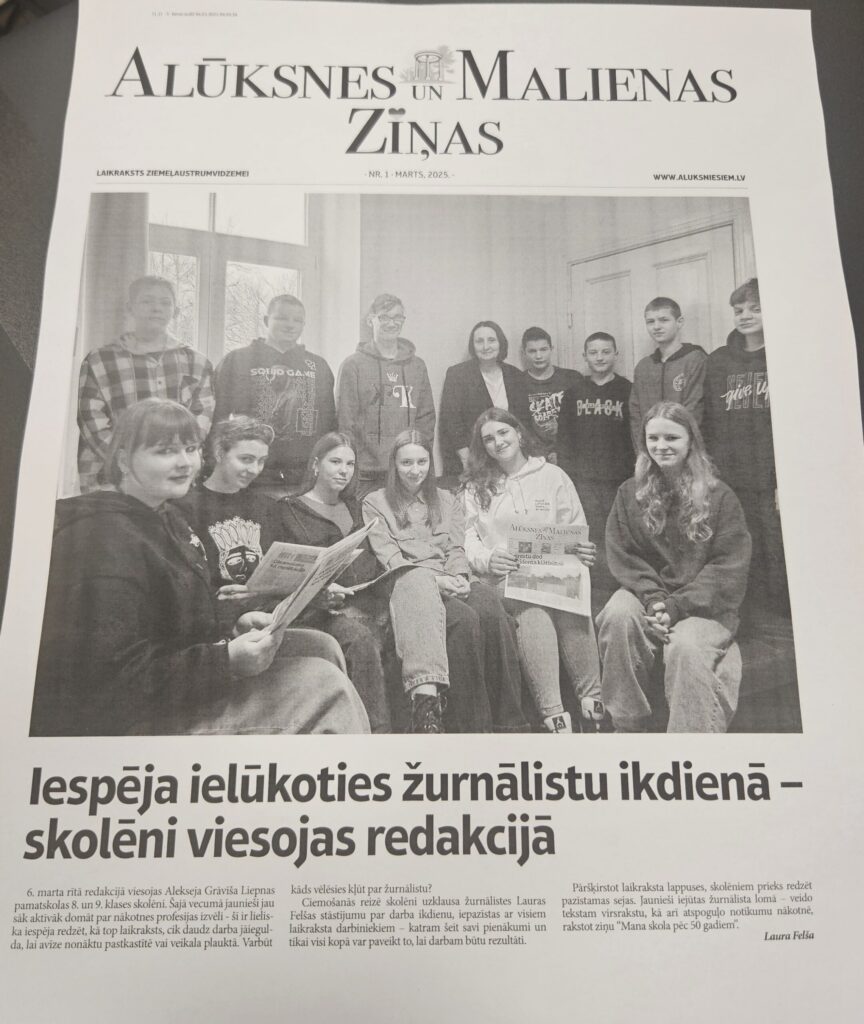 Alekseja Grāvīša Liepnas pamatskolas 8. un 9. klases skolēni apciemo redakciju, lai vairāk uzzinātu, kā top “Alūksnes un Malienas Ziņas”. Jaunieši iejūtas žurnālista lomā un jau izveidotam tekstam domā virsrakstu, kas nemaz nav tik vienkārši. Kas zina, varbūt nākotnē kāds no šiem jaunajiem cilvēkiem būs tas, kurš piedalīsies laikraksta tapšanā! Paldies par apciemojumu un izrādīto interesi.