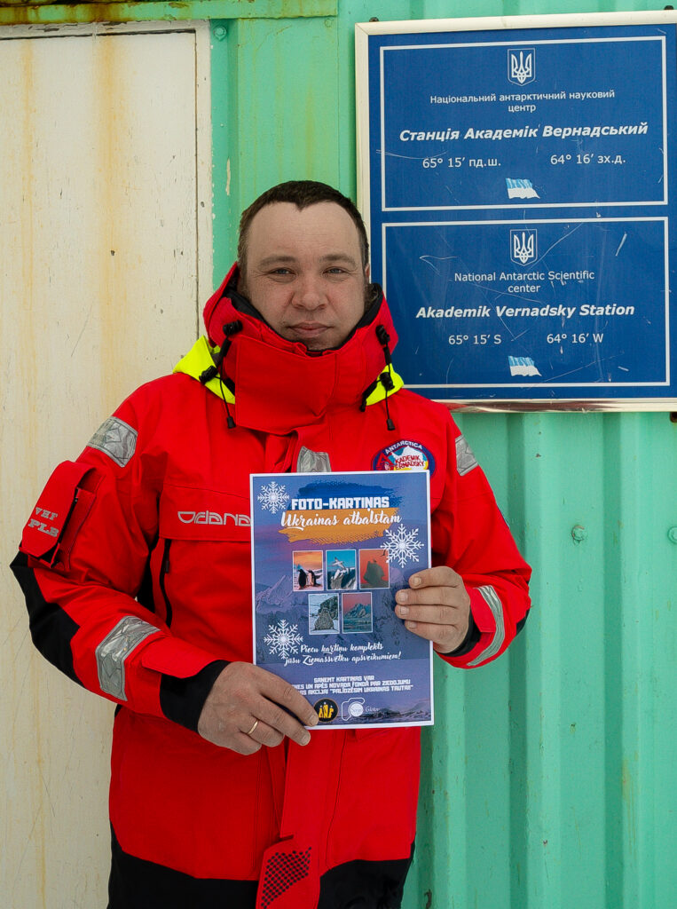 Fotogrāfiju autors Sergijs Glotovs ir Ukrainas Nacionālās Zinātņu akadēmijas Valsts Dabas vēstures institūta muzeja jaunākais pētnieks, kurš jau sešus mēnešus strādā Ukrainas Antarktikas ekspedīcijas sastāvā kā ziemas biologs. Paralēli zinātniskajai darbībai viņš aizraujas ar fotografēšanu. “Veidot sadarbību ar Sergiju Glotovu ieteica ukraiņu skolotāja Olga Istocka, kura patvērumu no kara skartās Ukrainas rada Alūksnē. Viņa zināja, ka fotogrāfs ar saviem darbiem jau piedalījies vairākās labdarības akcijās dažādās pasaules vietās, lai piesaistītu līdzekļus Ukrainas atbalstam. Fotogrāfs izveidojis labdarības fotoizstāžu sēriju “Baltās krāsas kontinents” jeb Ukraina Antarktikā. Sadarbībā ar Sergiju Glotovu esam izveidojuši pat divas akcijas vienam mērķim – ziedojot Ukrainas aizsargu – ievainoto vīru, tēvu, dēlu, atbalstam – ir iespēja iegādāties kādu no Sergija Glotova fotogrāfijām vai Ziemassvētku apsveikuma kartītes ar viņa bildēm no Antarktikas,” stāsta fonda pārstāve Jolanta Baldiņa.