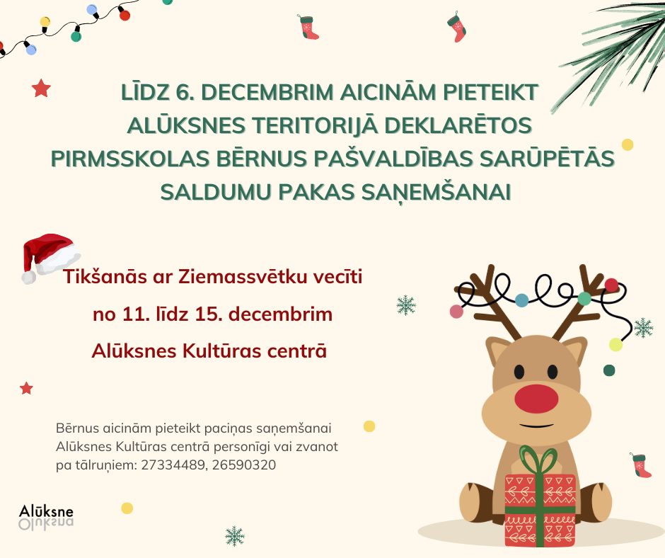 Vēl tikai līdz 6. decembrim Alūksnes novada pašvaldība aicina bērnu vecākus pieteikt Alūksnes teritorijā deklarētos pirmsskolas vecuma bērnus pašvaldības sarūpētās saldumu paciņas saņemšanai. Ziemassvētku saldumu paciņas paredzētas bērniem no dzimšanas līdz 7 gadu vecumam (ieskaitot), kuri vēl nav sākuši skolas gaitas.