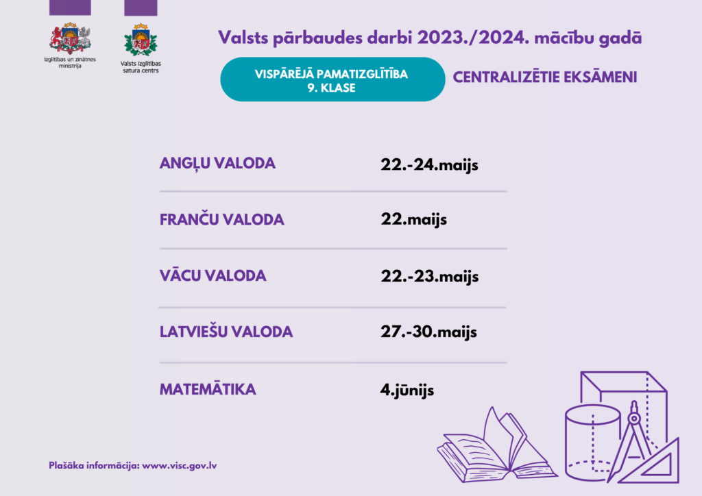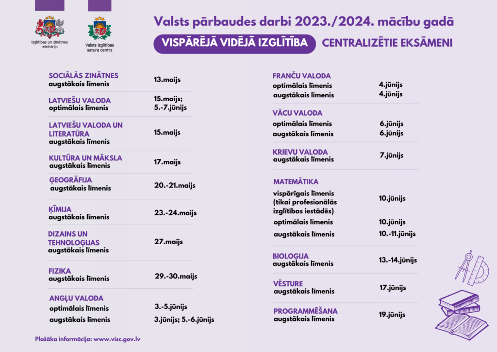 Vidusskolas vispārīgā un optimālā līmeņa matemātikas eksāmens pārcelts uz agrāku laiku – 10. jūniju, savukārt matemātikas augstākā līmeņa eksāmens – uz 10. jūniju (pirmā un otrā daļa) un 11. jūniju (trešā un ceturtā daļa). Tā kā vidējās izglītības centralizētos eksāmenus matemātikā kārto liels skaits skolēnu, operatīvākai eksāmenu vērtēšanas īstenošanai tie no 13. un 14. jūnija pārcelti uz 10. un 11. jūniju. Savukārt 13. jūnijā (rakstu daļa) un 14. jūnijā (praktiskā daļa) notiks augstākā līmeņa bioloģijas eksāmens.