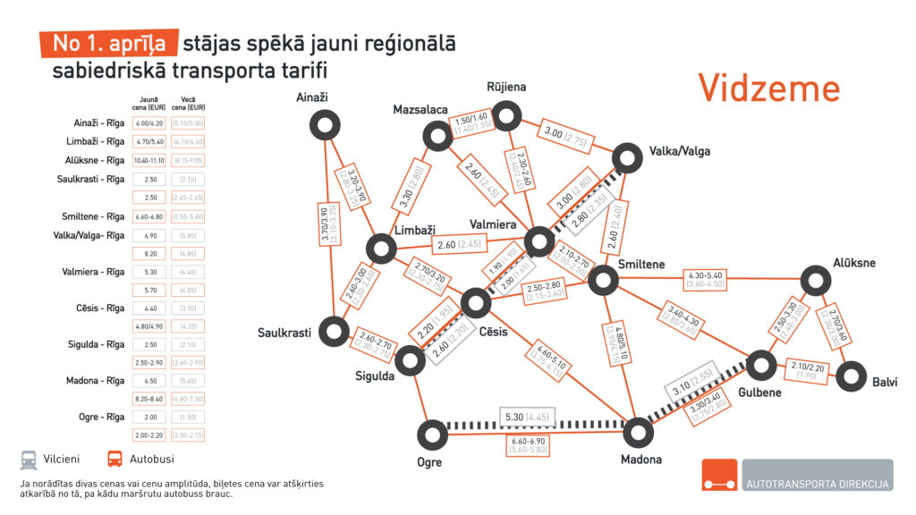Arī maršrutā Alūksne – Rīga būs cenu izmaiņas. Iepriekš biļeti varēja iegādāties par 8,15 līdz 9,05 eur vērtībā. Jaunā cena – 10,40 līdz 11.10 eur.