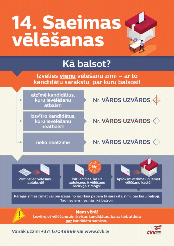 Varēs balsot jebkurā vēlēšanu iecirknī Latvijā vai ārvalstīs. Vēlēšanu dienā, 1. oktobrī, iecirkņi būs atvērti no pulksten 7.00 līdz 20.00.