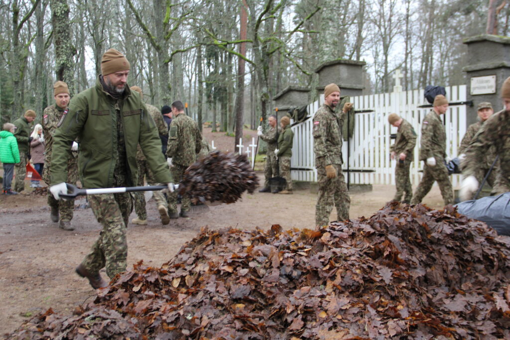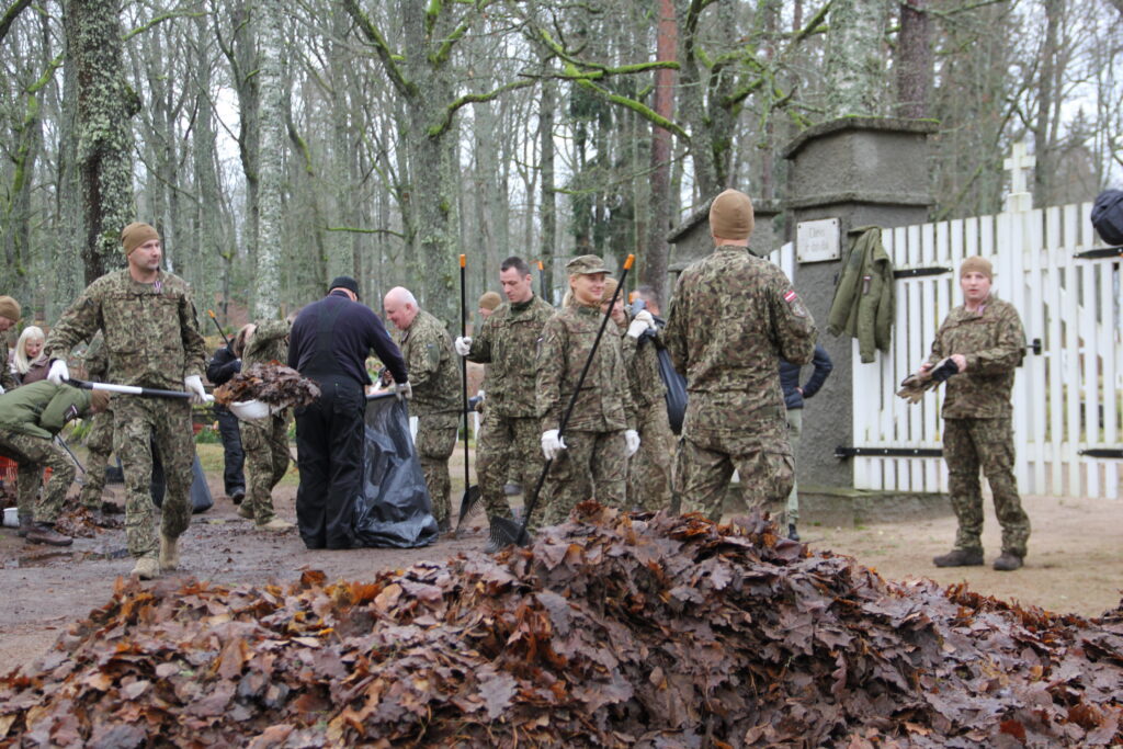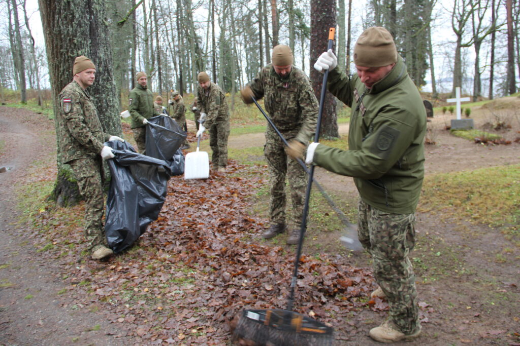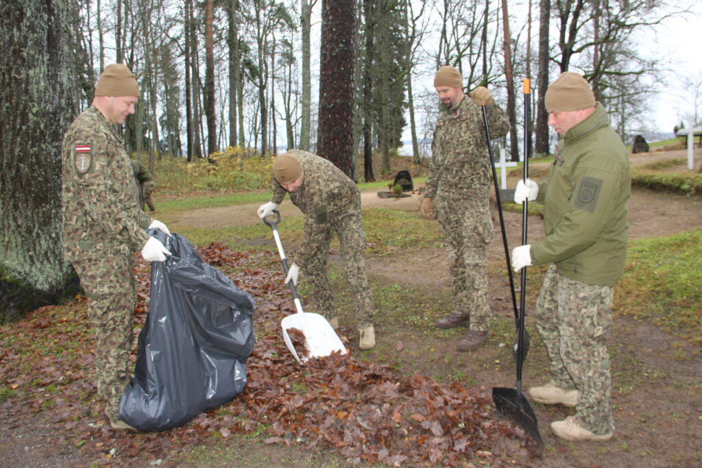 Tradicionāli pirms Lāčplēša dienas Nacionālo bruņoto spēku Kājnieku skolas personāls sakopj Lāčplēša Kara ordeņa kavalieru kapu kopiņas, 7. Siguldas Kājnieku pulka pieminekļa kalna un Alūksnes Garnizona kapu teritorijas, kā arī Kājnieku skolai piegulošā Alūksnes muižas parka teritoriju. Arī šī diena nebija izņēmums un Kājnieku skolas pārstāvji, bruņojušies ar grābekļiem, maisiem un ķerrām, stundas laikā iecerētos sakopšanas darbus Garnizona kapu teritorijā bija paveikuši.