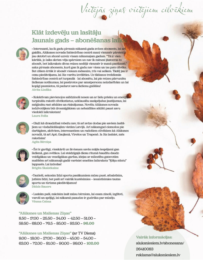 Preses izdevējiem un lasītājiem jaunais gads iestājas divreiz – tradicionāli 1. janvārī un 1. oktobrī. Tad sākas jaunais abonēšanas periods 2025. gadam, kas turpinās līdz pat decembra beigām, aicinot lasītājus abonēt vietējo laikrakstu “Alūksnes un Malienas Ziņas”, kas jums savos stāstos ir vistuvākais. Kādā seriālā par kādas Anglijas mazpilsētas dzīvi lokālā laikraksta redaktore teica apmēram tā: vietējā avīze ceļ godā ikdienu, – un es aptvēru, cik tie ir patiesi vārdi. Jā, globāli notikumi ir jāzina, bet mēs rakstām par to, kas jums, ik katram, ir svarīgs šeit uz vietas. Laikraksta lappusēs un portāla slejās arī turpmāk ar jums tiksies Aivita Lizdika, Agita Bērziņa, Laura Felša, Didzis Bauers un šo rindu autore Sandra Apine, kļūdu velniņus meklēs un “Ķēķa stāstus” gatavos Brigita Skaistkalne, savukārt par reklāmu visu zinās Vēsma Celma. Lai zinātu vietējos jaunumus, nākamajā abonēšanas periodā mēnesī fiziskai personai jāiegulda 8,50/9,00 eiro mēnesī (ar vai bez TV programmas). Kā vienmēr, izdevīgāk avīzi abonēt visam gadam, ietaupot viena mēneša cenu. Ir iespēja abonēt arī digitālo saturu. Oktobrī gaidiet “Laimīgo nedēļu”, kad abonēt gan pastā, gan redakcijā būs īpaši izdevīgi, abonēšanas rosināšanai esam sarūpējuši arī izglītojošas dāvaniņas – vērtīgus žurnālus un grāmatas. Paldies uzticīgajiem abonentiem un cerīgi sveicieni tiem, kuri, iespējams, šogad par tādiem kļūs!