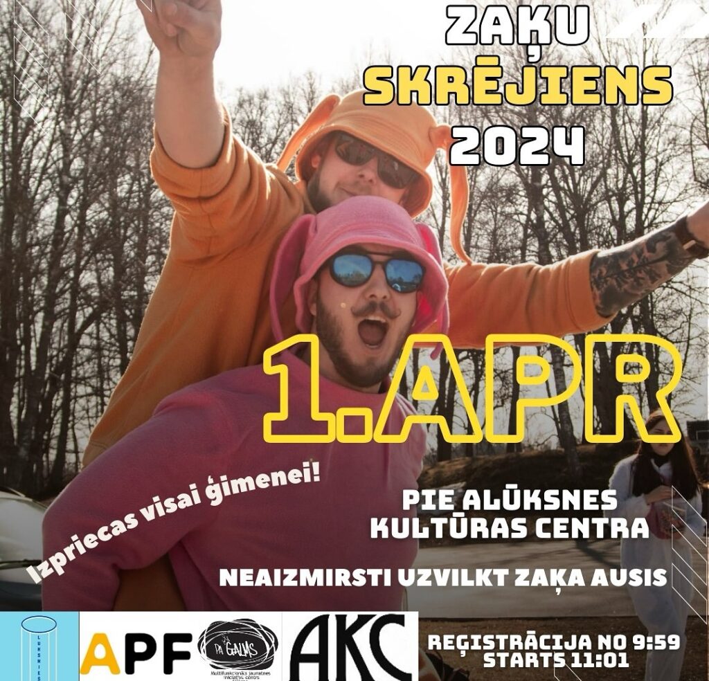 Otrajās Lieldienās, 1. aprīlī, Alūksnes Kultūras centra automašīnu stāvlaukumā noritēs ikgadējais “Zaķu skrējiens”, kuru rīko Alūksnes Bērnu un jauniešu centrs. Kā jau pienākas joku dienā 1. aprīlī, šoreiz reģistrācijas un starta laiks būs mazliet citādāks – pulksten 09.59 un 11.01.