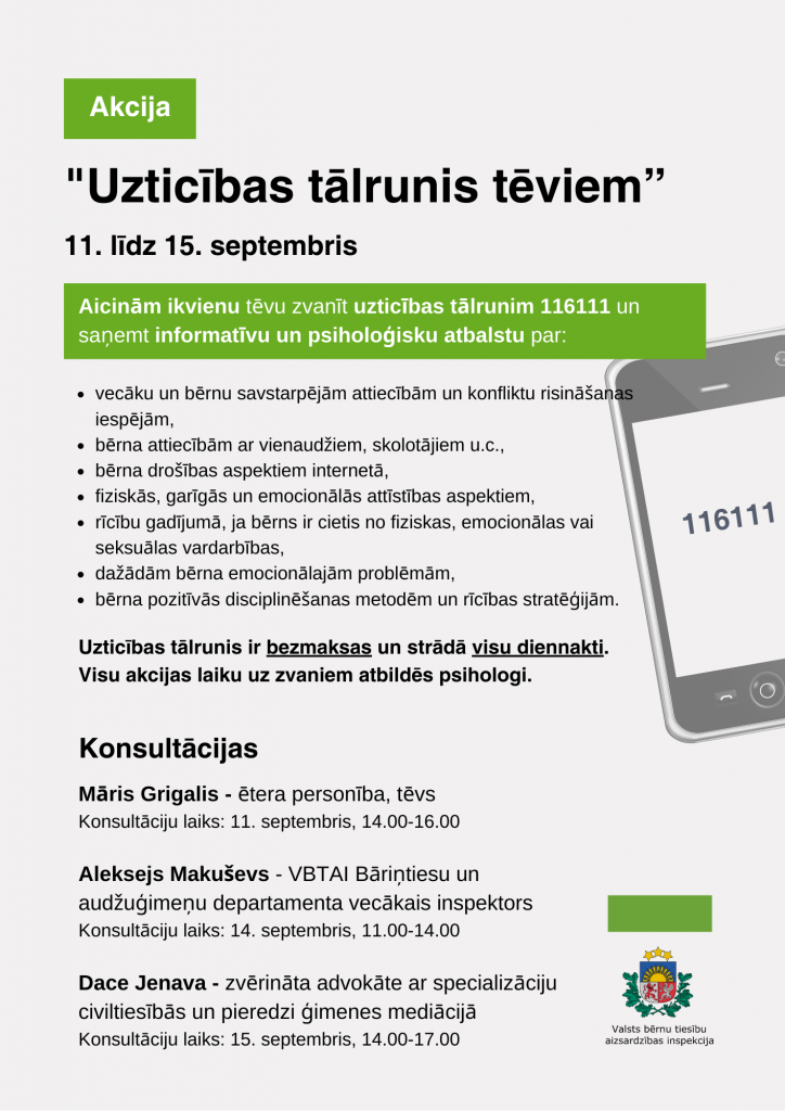 Septembra otrajā svētdienā Latvijā tradicionāli tiek atzīmēta Tēva diena. Šogad to svin 13. septembrī, tādēļ Valsts bērnu tiesību aizsardzības inspekcijas (VBTAI) Bērnu un pusaudžu uzticības tālrunis 116111 (UT) no 11. līdz 15. septembrim rīko akciju “Uzticības tālrunis tēviem”. Vēsta Valsts bērnu aizsardzības inspekcijas pārstāvis Taivo Trams.
