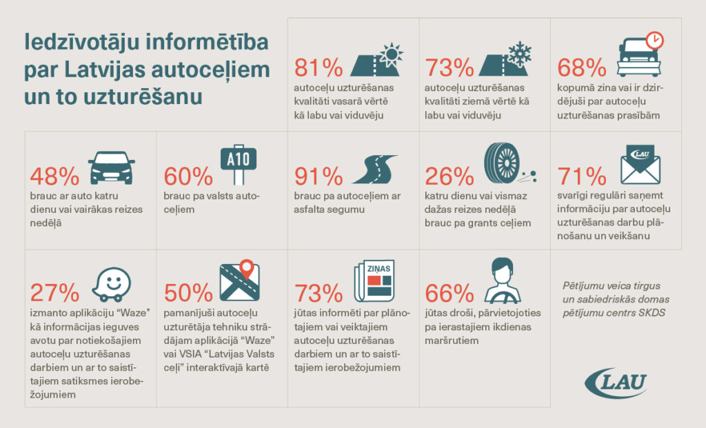 VAS “Latvijas autoceļu uzturētājs” veiktajā aptaujā*, kurā tika analizēta iedzīvotāju informētība par Latvijas autoceļiem un to uzturēšanu, noskaidrots, ka 81% aptaujāto autoceļu uzturēšanas kvalitāti vasarā vērtē kā labu vai viduvēju, bet ziemā 71% respondentu. Attiecībā uz aptaujāto informētību par autoceļu uzturēšanas prasībām, 68% respondentu norādīja, ka par tām kopumā zina vai ir dzirdējuši, vēsta LAU Komunikācijas nodaļā.