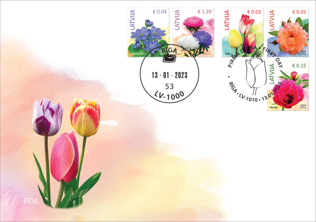 Arī filatēlijas sērija Ziedi tiek papildināta ar trim jaunām pastmarkām, un uz tām attēlota tulpe, roze un peonija – katras pastmarkas tirāža sasniedz 100 000 eksemplāru. Līdz ar jaunajām pastmarkām 800 eksemplāru tirāžā izdota arī pirmās dienas aploksne.