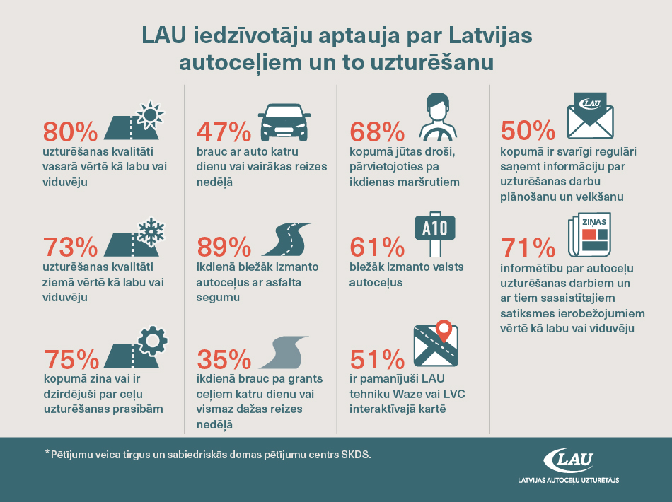 VAS “Latvijas autoceļu uzturētājs” (LAU) veiktajā aptaujā, kurā tika analizēta iedzīvotāju informētība par Latvijas autoceļiem un to uzturēšanu, noskaidrots, ka 80% aptaujāto autoceļu uzturēšanu vasarā vērtē kā labu vai viduvēju, bet ziemā 73%. Lielākais vairums jeb 89% respondentu ikdienā izmanto autoceļus ar asfalta segumu, savukārt 35% no autobraucējiem katru dienu vai vismaz dažas reizes nedēļā brauc pa grants ceļiem.