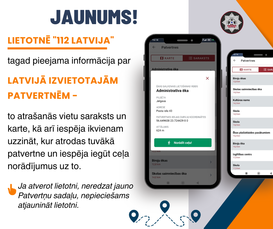 Valsts ugunsdzēsības un glābšanas dienests (VUGD) informē, ka lietotnē “112 Latvija” ir ieviesta jauna funkcionalitāte – iespēja apskatīt sev tuvākās pieejamās patvertnes. Šis risinājums izstrādāts ar mērķi uzlabot sabiedrības informētību un spēju operatīvi reaģēt ārkārtas situācijās.