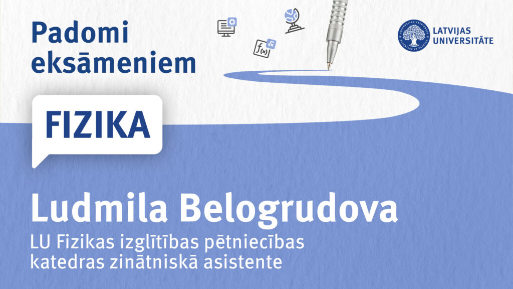 Stiprinot vidusskolēnu pārliecību par savām spējām, tuvojoties izvēles eksāmenam fizikā, Latvijas Universitāte (LU) piedāvā LU ekspertes Ludmilas Belogrudovas lekcijas ierakstu no pasākuma vidusskolēniem “Padomi eksāmeniem”. Tajā sniegti noderīgi padomi par veiksmīgu sagatavošanos eksaktā priekšmeta pārbaudes darbam.