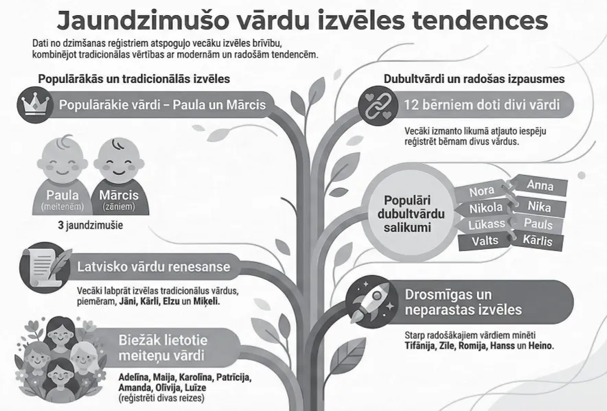 Vārdu izvēle ļoti “raiba” un daudzveidīga. 12 dzimšanas reģistros ir ierakstīti vecāku izvēlētie un likumā atļautie divi vārdi. Meitenēm – Nora Anna, Sallija Mija, Nikola Nika, Mia Emīlija. Zēniem – Alberts Ādams, Lūkass Pauls, Valts Kārlis, Klāvs Adrians, Gabriels Henriks, Eliots Jānis, Orlando Kevins, Rodrigo Rauls. Meitenēm  populārākais vārds, ko vecāki dāvājuši – Paula (3), Adelīna, Maija, Karolīna, Patrīcija, Amanda, Olīvija, Luīze (2). Zēniem iecienītākie vārdi Mārcis (3), Gustavs, Pauls, Everts, Kurts (2). Vecāki saviem mazuļiem izvēlējušies arī latviskus vārdus: Maija, Elza, Miķelis, Jānis, Kārlis, Augusts, Dāvis. Pērn mazuļu vecāki bijuši radoši, izvēloties savām atvasēm neparastus vārdus: meitenēm – Tifānija, Zīle, Romija. Zēniem – Hanss, Heino, Brajens, Nikalaijs, Orlando.