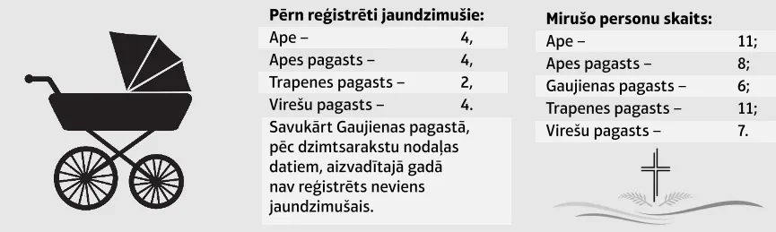 Dzimtsarakstu nodaļā pagājušajā gadā sastādīti 114 dzimšanas reģistri. 110 bērniņu deklarētās dzīvesvietas ir Smiltenes novadā, bet 4 bērniņu – citā pašvaldībā. No 114 reģistrētajiem jaundzimušajiem – 57 meitenes un 57 zēni. Visvairāk dzimušo (15) reģistrēti augustā un oktobrī, vismazāk (6) februārī. 38 ģimenēs dzimis pirmais bērniņš, 34 ģimenēs otrais bērniņš, 23 ģimenēs trešais mazulis, 9 ģimenēs sagaidīts ceturtais bērns, 4 ģimenēs dzimis piektais bērns, 3 ģimenēs sestais un divās ģimenēs septītais bērniņš. Laulībā dzimis 61 bērns, atzīta paternitāte 49 bērniem. Nav ieraksta reģistros par bērna tēvu 4 bērniem. Aizvadītais gads īpaši laimīgs bija divās ģimenēs, kurās piedzimuši dvīnīši.