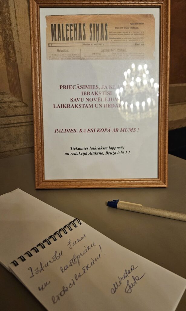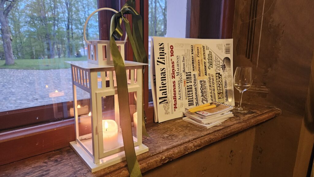 Īpaša pateicība visam Alūksnes novada muzeja kolektīvam par sadarbību, rūpēm un izdomu Muzeju nakts norisēs, Alūksnes novada bibliotēkai par simtgades publikācijām un pirmā “Malienas Ziņu” numura sarūpēšanu! Redaktores pateicība arī visam “Alūksnes un Malienas Ziņu” kolektīvam, kas pasākumā atraktīvi iejutās jaunā – muzejnieka – ampluā, stāstot mūsu vērtību stāstu kopā ar muzeja darbiniekiem.