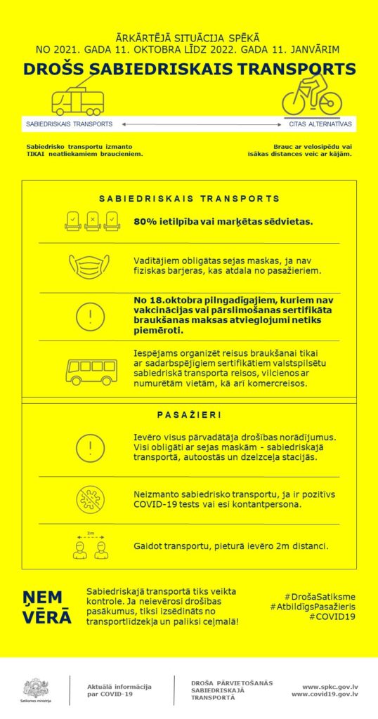 No 2021.gada 11. oktobra līdz 2022. gada 11. janvārim Latvijā ir izsludināta ārkārtējā situācija un noteikts, ka no 18.oktobra pilngadīgajiem, kuriem nav vakcinācijas vai pārslimošanas sertifikāta braukšanas maksas atvieglojumi netiks piemēroti. Tāpat kā līdz šim, paliek spēkā sejas masku obligāta lietošana, distancēšanās ievērošana un transportlīdzekļu regulāra dezinfekcija un vēdināšana, “Alūksniešiem.lv” informēja Satiksmes ministrijas Komunikācijas nodaļā.