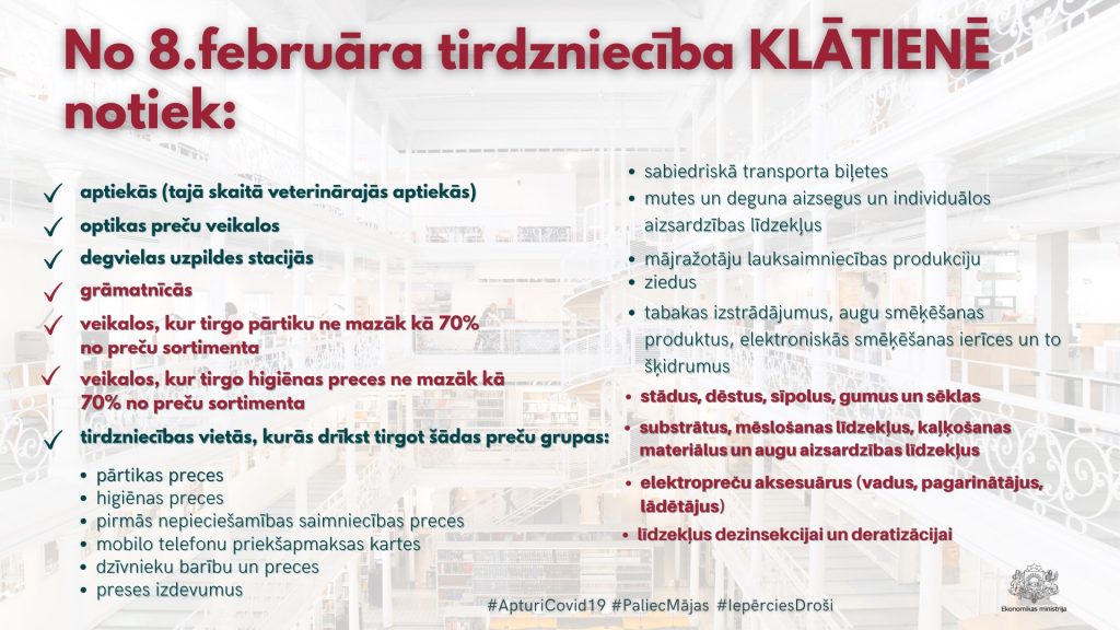 No pirmdienas, 8.februāra, tirdzniecību klātienē ar visu preču sortimentu varēs nodrošināt ne tikai aptiekās, tajā skaitā veterinārajās aptiekās, optikas veikalos un degvielas uzpildes stacijās, bet arī grāmatnīcās, pārtikas veikalos un higiēnas preču veikali, t.i. veikalos, kur ne mazāk kā 70% no preču sortimenta tirgo attiecīgi pārtiku un higiēnas preses, vēsta Ekonomikas ministrija.