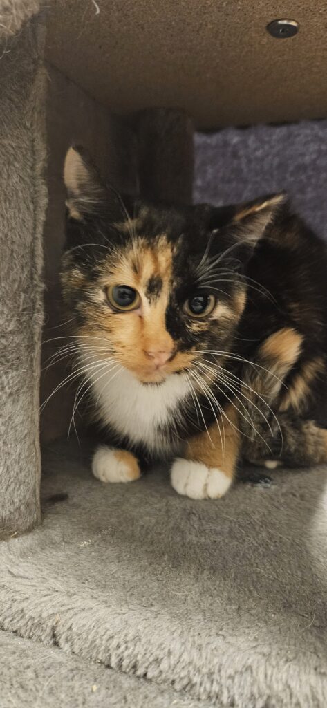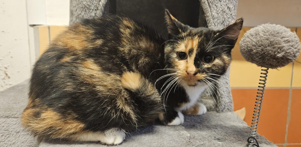Savu jauno saimnieku gaida trīskrāsu kaķenīte, kurai būs iespēja iedot arī jaunu vārdu. Kaķenīte ir pusaudze, apmēram septiņus mēnešus veca, dzīvojusi gan telpās, gan ārā, vesela, turklāt sterilizēta, un gatava doties uz savām jaunajām mājām. Patversmes “Astes un Ūsas” darbinieki novērojuši, ka viņa ir aktīva, draudzīga un mīlīga, labprāt dodas rokās un ļauj paglāstīt. Par to pārliecinājās arī šo rindu autore. Kaķīte rosoties savā nodabā, bet reizēm mēdz pievērst cilvēku uzmanību ar klusu smalku balstiņu. N. Šapovala ir pārliecināta, ka šis kaķis būs lielisks mājas mīlulis. Viņa zina stāstīt, ka trīskrāsu murrātājus mēdz dēvēt par laimes un naudas kaķiem, turklāt šis trīs krāsu salikums esot pavisam īpašs. “Nekad neesmu redzējusi tik ģeometriski precīzu krāsu dalījumu – vienā pusē purniņam viena krāsa, otrā – cita,” viņa uzsver.