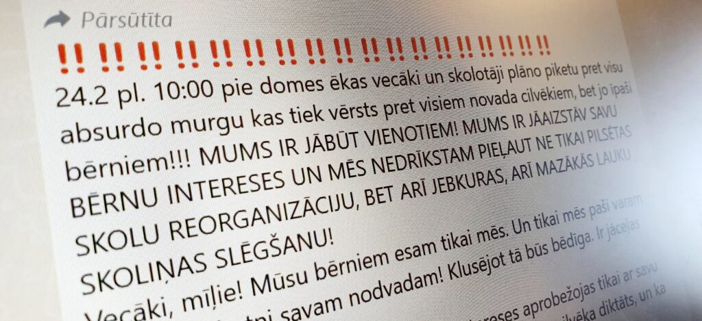 “Vecāki un skolotāji plāno piketu pret visu absurdo murgu, kas tiek vērsts pret visiem novada cilvēkiem, bet jo īpaši bērniem! Mums ir jābūt vienotiem! Mums ir jāaizstāv savu bērnu intereses un mēs nedrīkstam pieļaut ne tikai pilsētas skolu reorganizāciju, bet arī jebkuras, arī mazākās lauku skoliņas slēgšanu,” vēstīts aicinājumā, uzsverot, ka “ir jāceļas kājās!” un šis pikets ir iespēja parādīt savu nostāju.
