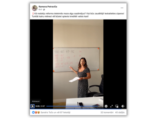 To, ka mazo algu saņēmēji “būs zaudētāji”, saviem sekotājiem Facebook stāstīja arī Latvija pirmajā vietā deputāte Ramona Petraviča. Ar viņas video kopumā dalījušies vairāki simti.