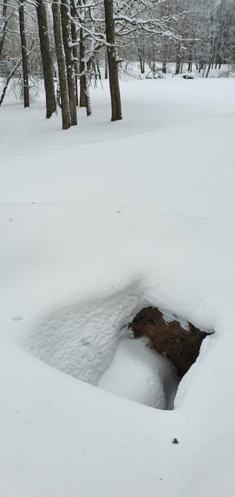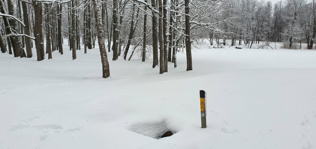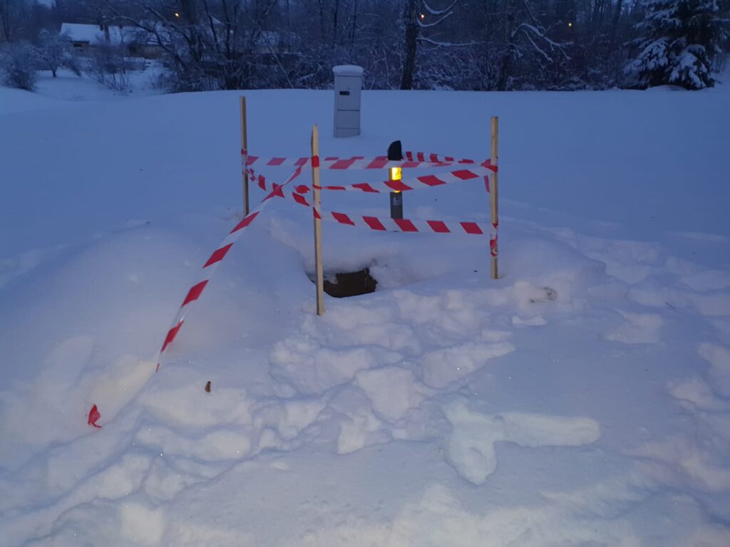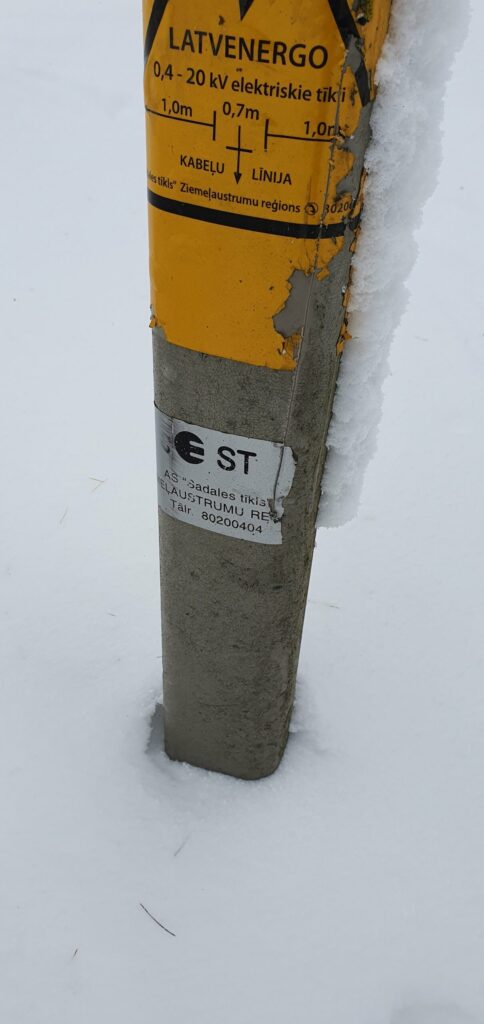 Aizdodoties uz norādīto vietu, pārliecinājāmies, ka zvanītājai taisnība – bedre patiešām ir visiem pieejamā vietā, apmēram metru reiz metru liela, izskatījās arī gana dziļa, lai kritiens tajā varētu radīt nepatīkamas sekas. Piedevām, bedres malas pašlaik sedz biezs sniegs, kas tās apmērus piesedza. Līdzas bedrei atradās AS “Sadales tīkli” stabiņš, kas apzīmē augstsprieguma elektrokabeļa atrašanās vietu.
