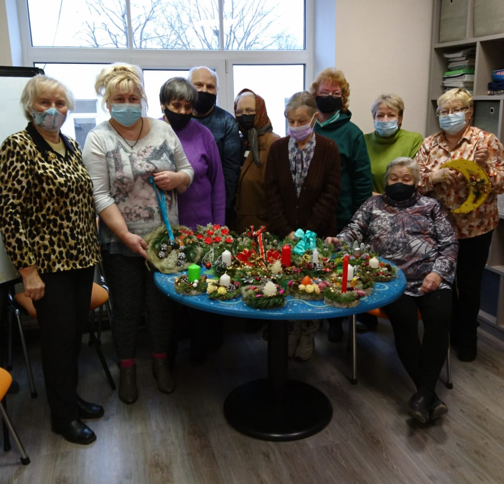 Adventa laikam un Ziemassvētkiem biedrība sākusi gatavoties jau pirms valsts svētkiem, dāvanu, svētku dekoru un citu rotājumu izgatavošanā uzaicinot dalīties pieredzē ziemerieti Jāni Bērtiņu (attēlā vidū).
